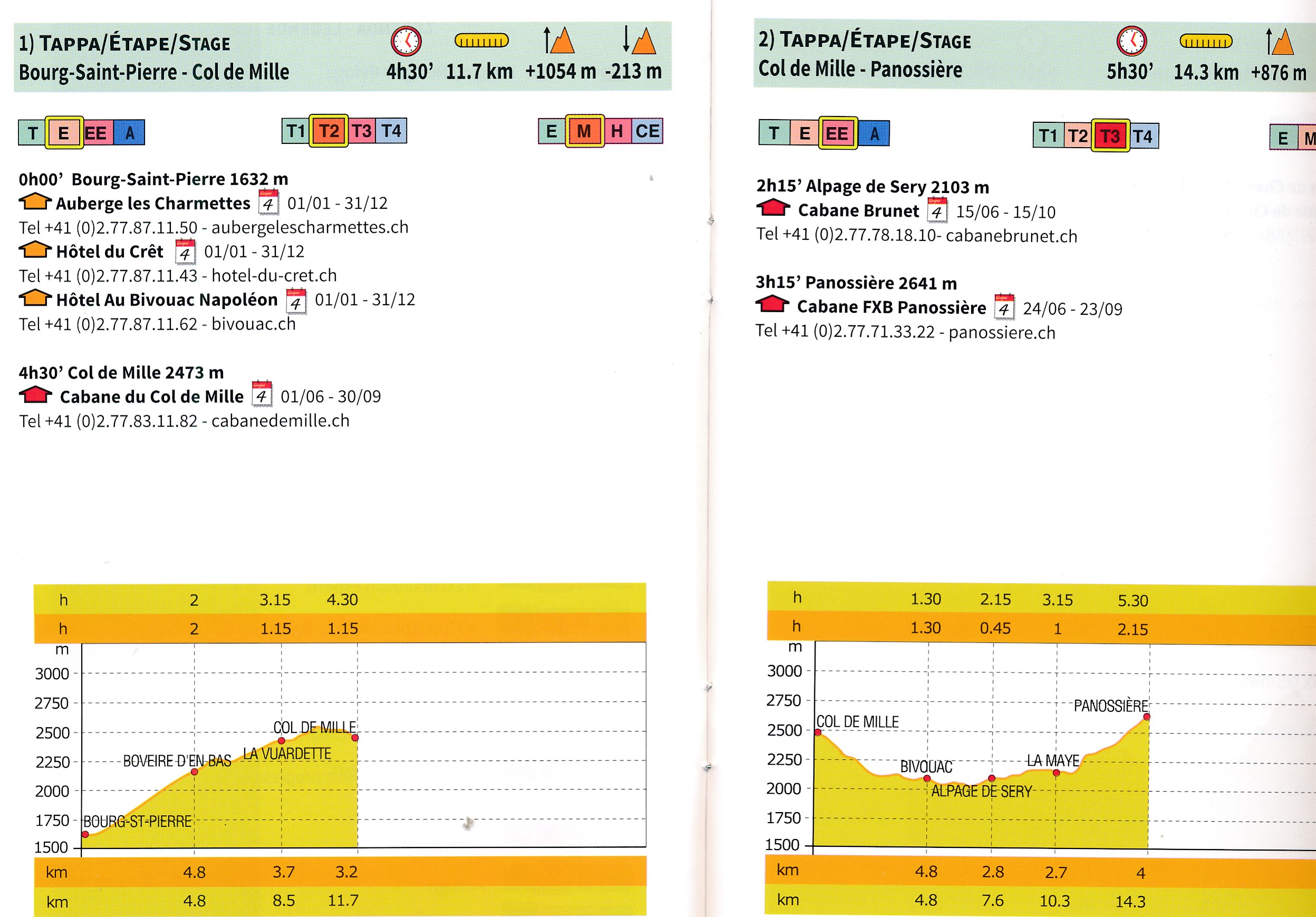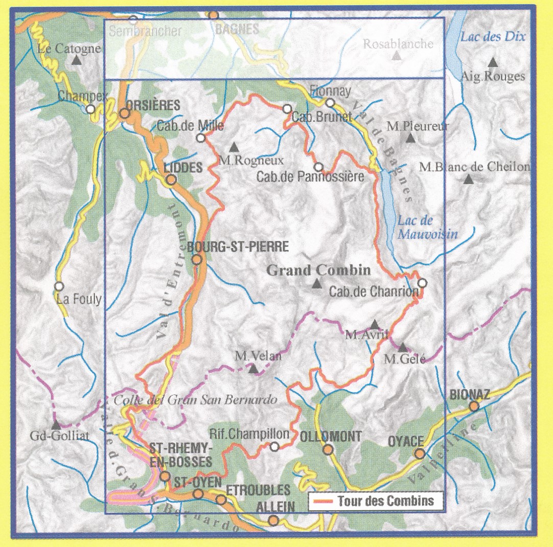 Eeb bijzonder duidelijke wandelkaart van de de Tour des Combins, een hooggelegen circuit in 6 etappes tussen Italië en Zwitserland, tussen de valleien van Ollomont, Gran San Bernardo, Entremont en Bagnes. Met ingetekende routes, berghutten en een bijgevoegd boekje met hoogteprofielen.