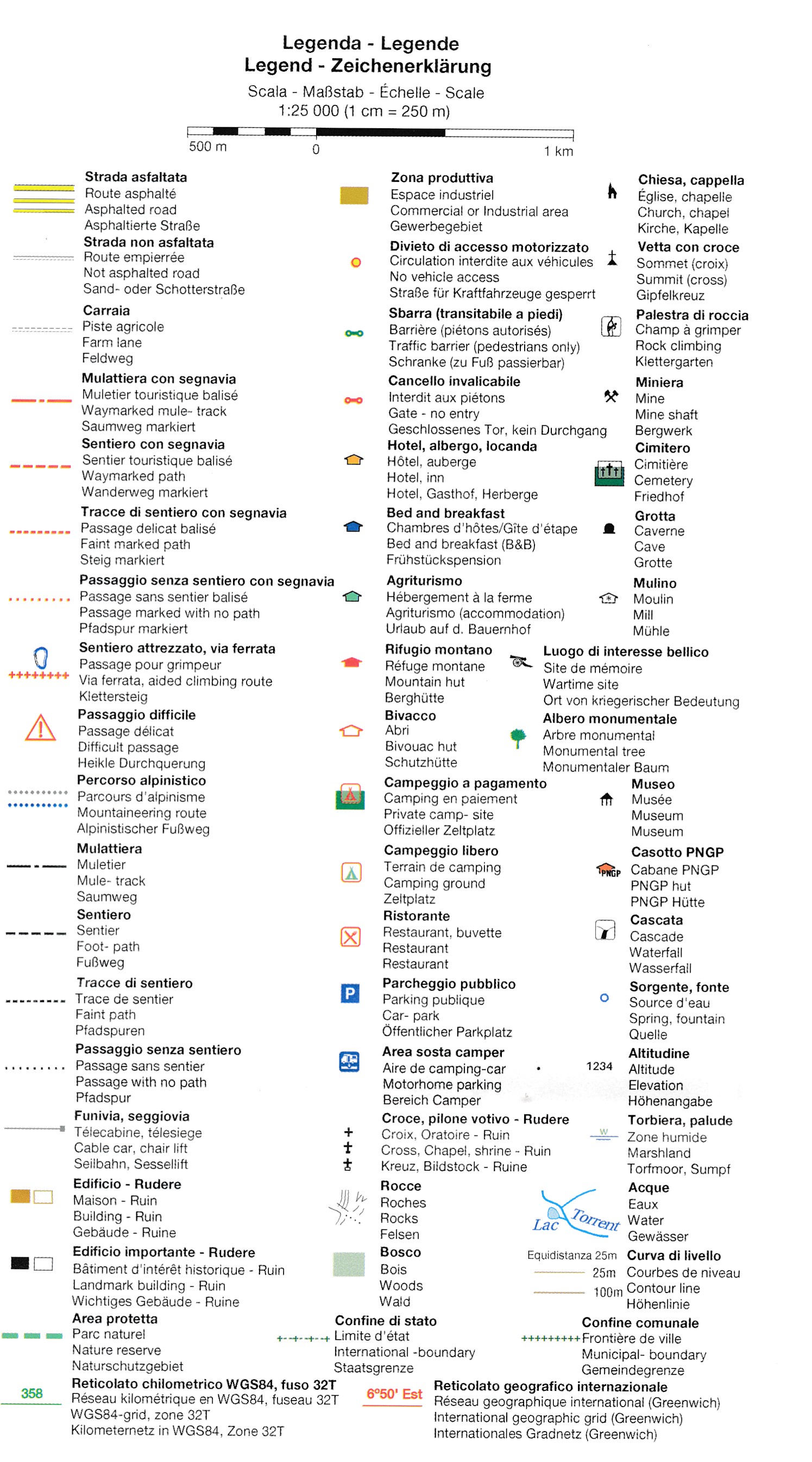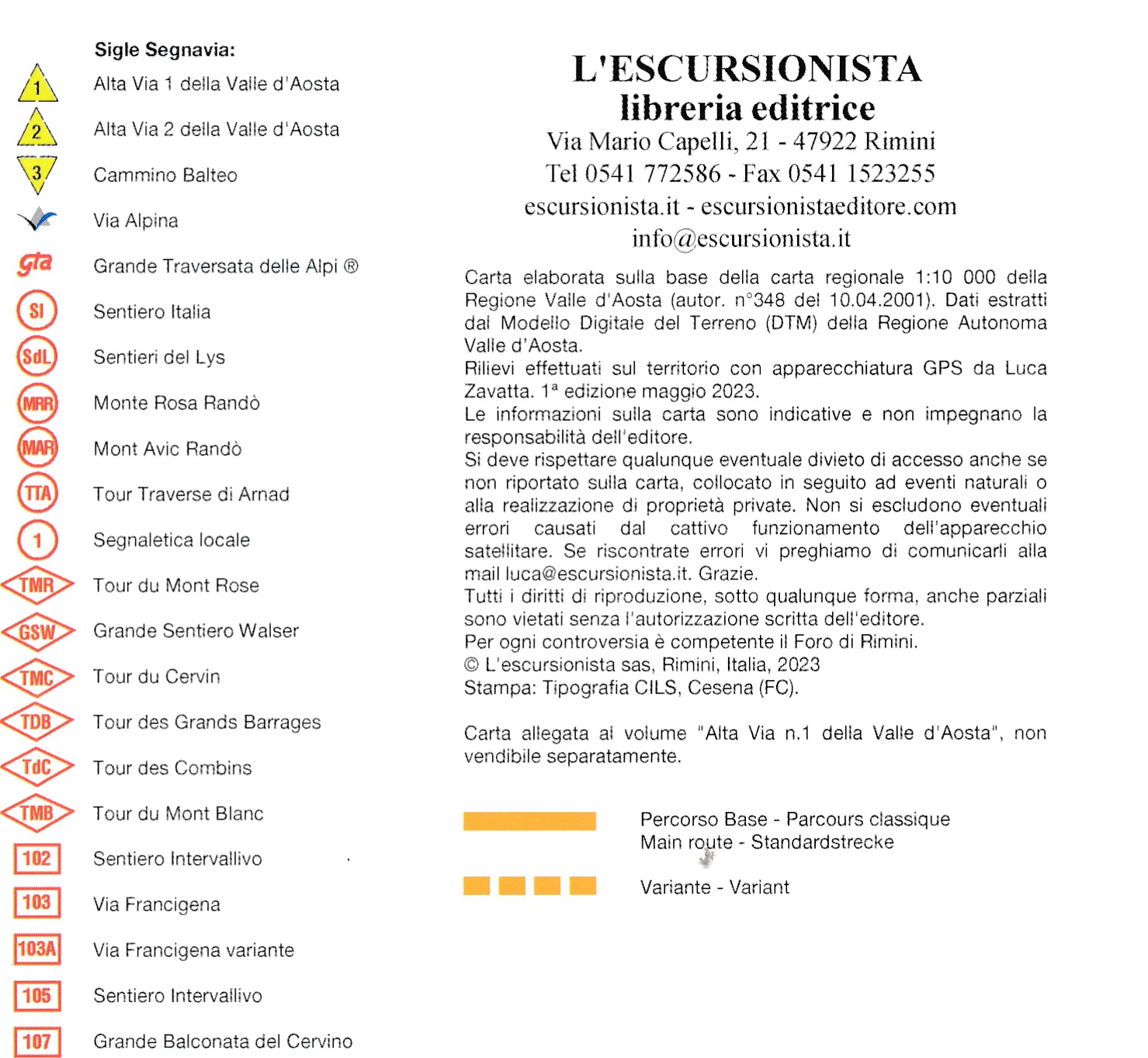 Alta Via n.1 van Valle d'Aosta of Alta Via dei Giganti is een prachtige trektocht op grote hoogte die alle noordelijke valleien van de regio doorkruist, met herhaalde en onvergelijkbare glimpen van Monte Rosa, Cervino, Dent d'Hérens, Grand Combineer en tot slot de Grandes Jorasses. Het wordt hier gepresenteerd in 14 etappes, vertrekkende van Donnas en aankomend in Courmayeur, waarvan de eerste 5 in de Leievallei, die bijna volledig bedekt is. De omgeving is gewoonweg uitzonderlijk en de overnachtingen vinden plaats in uitstekende accommodatiefaciliteiten, meestal toevluchtsoorden boven 2000 meter boven de zeespiegel. De gids, een fotografisch notitieboek met technische gegevens en alle contactgegevens van de tussenstops op de route, gaat vergezeld van een kaart gedrukt op een ecologische, waterdichte en resistente drager, met een UTM WGS84 kilometerraster, ook beschikbaar in een elektronische versie voor Android, iOS en Windows.