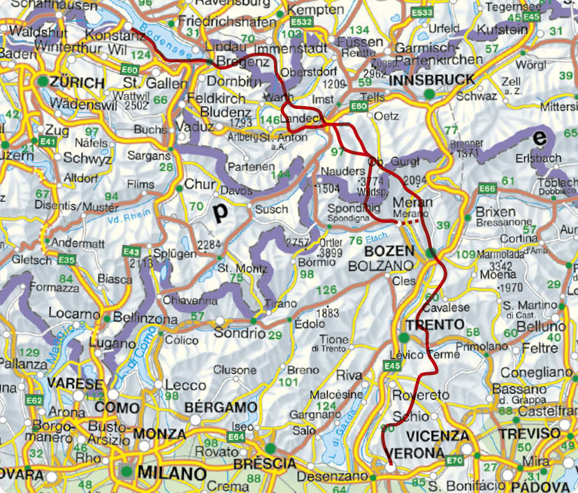 31 Etappen von Konstanz über Oberstdorf und Meran/Bozen nach Verona