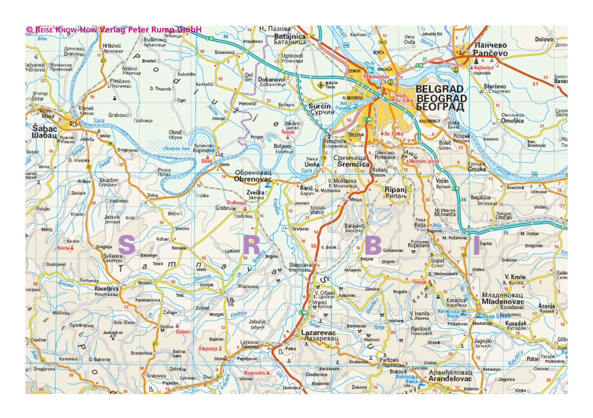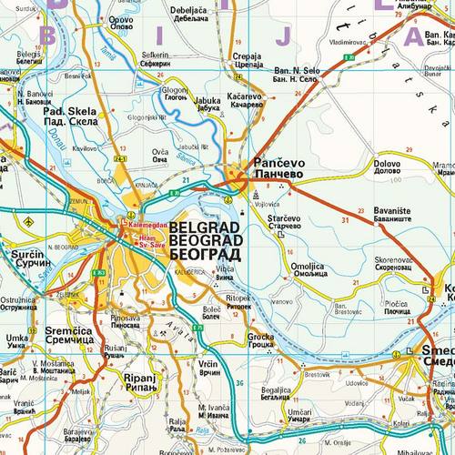 Prachtige landkaart van Servië met namen in het Engels en ondermeer in het Servisch, wat leuk is als toerist om de vertaling te zien van de plaatsnamen!