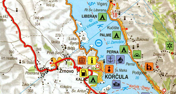 Uitstekende wegenkaart van een klein gebied van Split to Gradec aan de Dalmatische kust van Kroatie. Zeer gedetailleerde kaart met hoogtelijnen en andere topografische details, maar ook campings. Ideaal om deze eilanden per boot of auto / fiets te ontdekken.