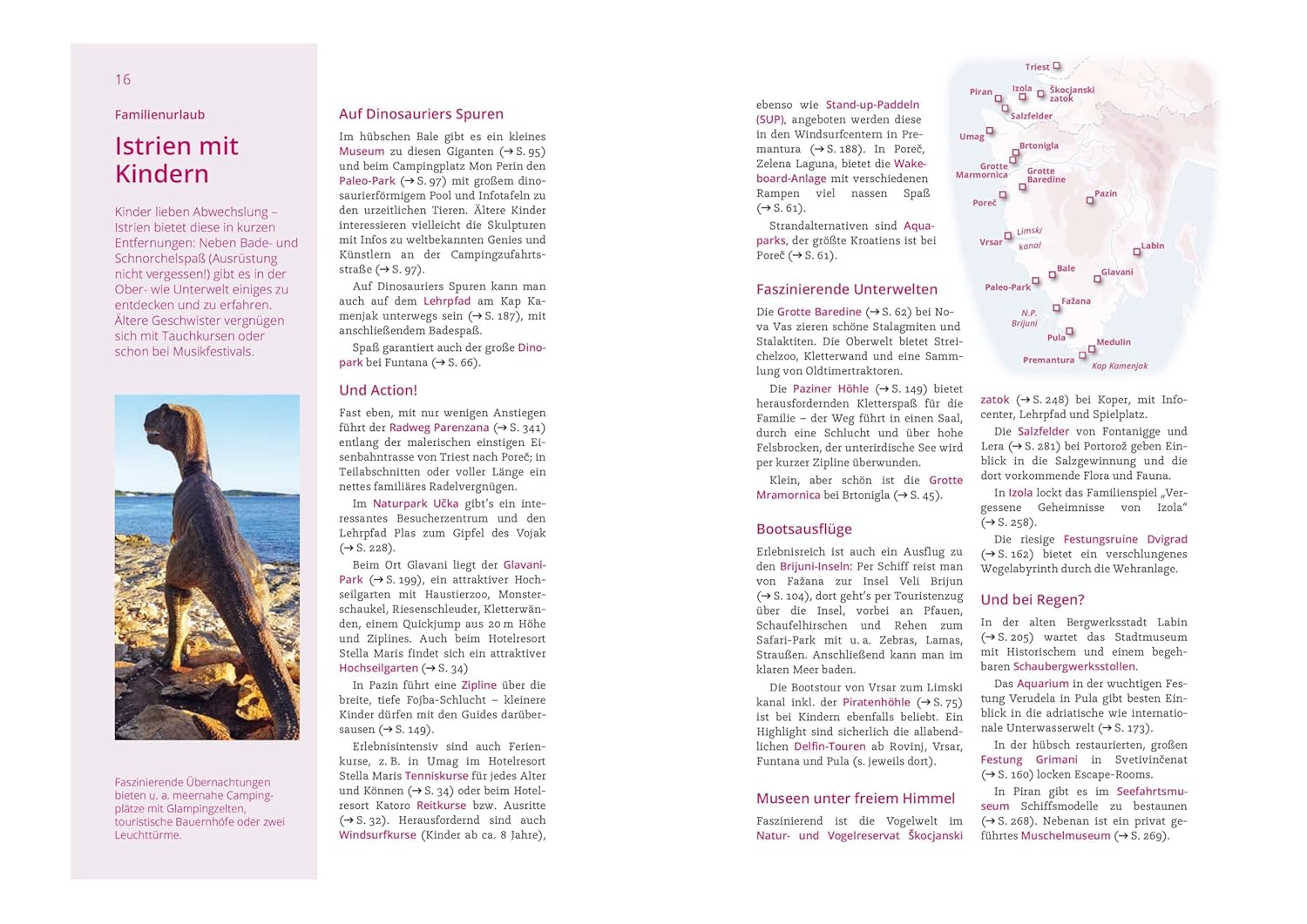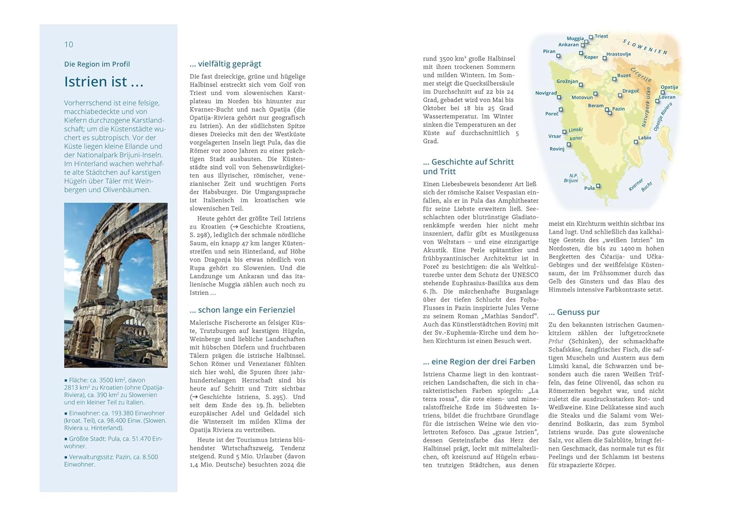 Pula an der Südküste Istriens ist Kultur- und Wirtschaftsmetropole. Wer an den Strand will, genießt das buchtenreiche Kap Kamenjak. An der Ostküste, der Kvarner Bucht, lohnt ein Besuch der alten Bergwerksstadt Labin. An der slowenischen Riviera finden Geschichtsbegeisterte venezianisch geprägte Städte, exklusive Unterkünfte findet man in Portorož. Im Hinterland begeistern Fresken, Kletterfelsen fordern Körperkraft und regionale Weine runden erlebnisreiche Tage ab. Die Geheimtipps von Lore Marr-Bieger erschließen Ihnen die Highlights sowie Sehenswertes abseits ausgetretener Pfade.