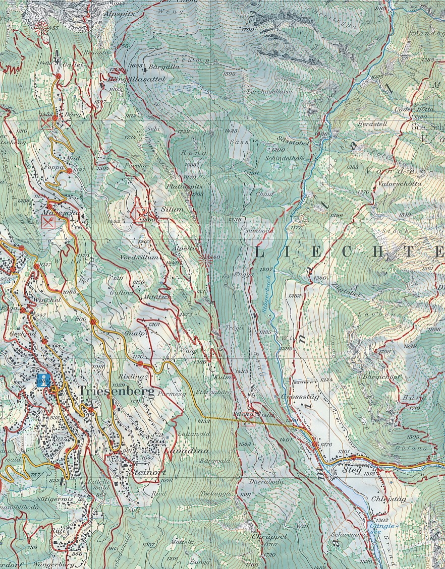 Topografische wandelkaart van Liechtenstein, met hoogtelijnen, ingetekende wandelroutes en veel informatie op de achterzijde over het gebied, bergwandelen in het algemeen en het gebruik van een kaart.