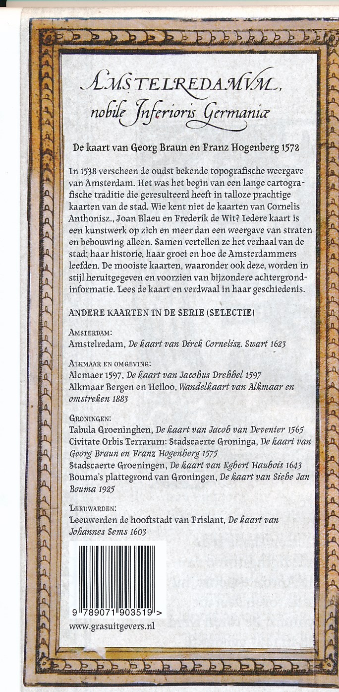 In de vroege zestiende eeuw verscheen de oudst bekende topografische weergave van Amsterdam. Het was het begin van een lange cartografische traditie die geresulteerd heeft in talloze prachtige kaarten van de stad. Wie kent niet de kaarten van Cornelis Anthonisz, Joan Blaeu en Frederik de Wit? Iedere kaart is een kunstwerk op zich en meer dan een weergave van straten en bebouwing alleen. Samen vertellen ze het verhaal van de stad; haar historie, haar groei en hoe de Amsterdammers leefden. De mooiste kaarten, waaronder ook deze, worden in stijl heruitgegeven en voorzien van bijzondere achtergrondinformatie. Lees de kaart en verdwaal in haar geschiedenis.