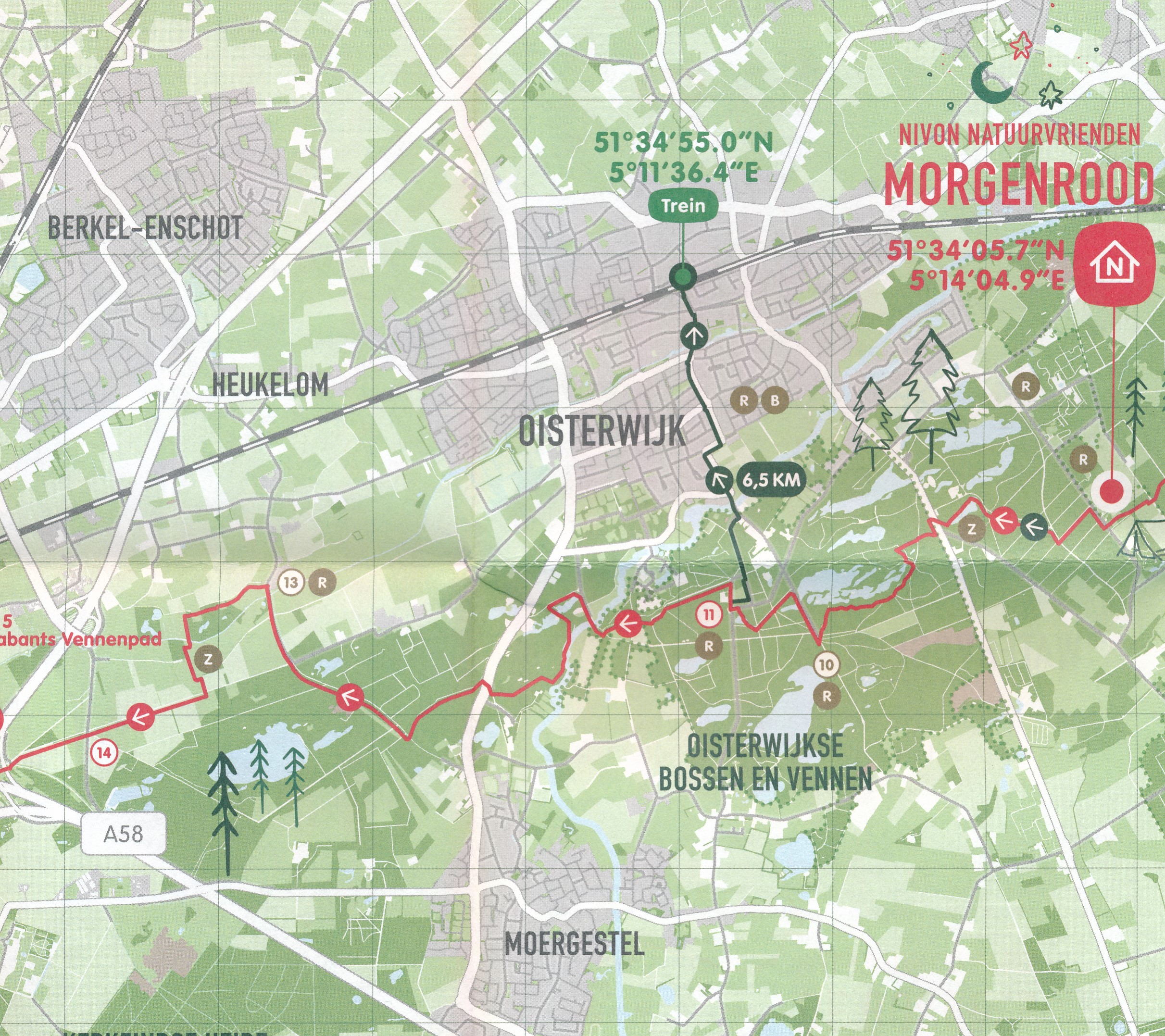 Je begint op het station van Boxtel. Na een kort stukje over een industrieterrein kom je al gauw in de groene natuur via het prachtige, oude Kerkpad. Nadat je de beek de Beerze hebt verlaten, kom je op de uitgestrekte goudgele heidevelden van de Kampina. Zodra je het Van Tienhovenmonument bent gepasseerd zie je de eerste vennen al. Deze volgen je tot de achteringang van de camping van Natuurvriendenhuis Morgenrood.