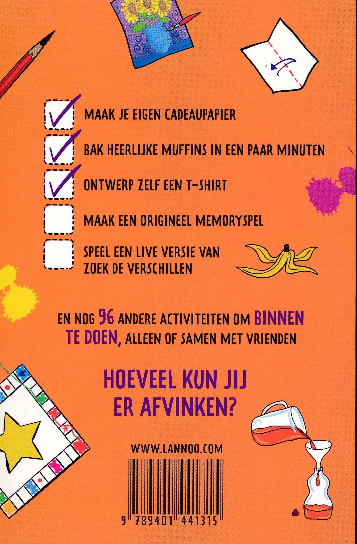De checklist voor kinderen met activiteiten om binnen te doen - Maak je eigen inpakpapier - Bak heerlijke muffins in een paar minuten - Ontwerp zelf een T-shirt - Speel een live versie van zoek de zeven verschillen - Maak een origineel memoryspel