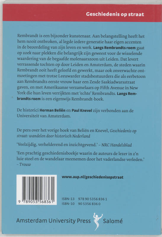 Nederland houdt van Rembrandt. In 2006 werd zijn vierhonderdste geboortejaar dan ook met veel feestgedruis en spraakmakende tentoonstellingen herdacht. Toch was dit eerbetoon minder vanzelfsprekend dan velen misschien denken. Rembrandt heeft zijn populariteit pas in de loop van de geschiedenis verworven, dankzij de activiteiten van connaisseurs, lokale elites, gemeentebesturen en museumdirecteuren. Aan de hand van concrete plaatsen en gebeurtenissen brengt Langs Rembrandts roem de groeiende bekendheid van de begaafde molenaarszoon uit Leiden in kaart. De auteurs nemen u mee naar de plek van zijn geboortehuis in Leiden, beschrijven de lotgevallen van het Amsterdamse Rembrandthuis, volgen het voetspoor van zijn bekendste schilderij De Nachtwacht en gaan in New York op zoek naar verzamelaars die hun leven verrijkten met ‘echte’ Rembrandts. Langs Rembrandts roem, het tweede deel in serie Geschiedenis op straat, is een eigenwijs Rembrandtboek dat laat zien hoe er in de loop van de tijd met het icoon Rembrandt is omgegaan en hoe hij is gebruikt voor eigen gewin. De auteurs nodigen de lezer uit om het spoor van de merknaam Rembrandt in binnen- en buitenland te volgen.