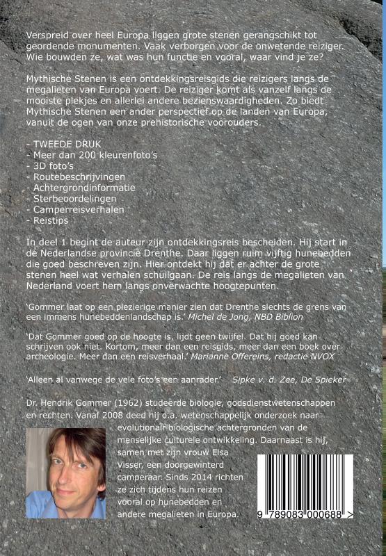 Verspreid over heel Europa liggen grote stenen gerangschikt tot geordende monumenten. Vaak verborgen voor de onwetende reiziger. Wie bouwden ze, wat was hun functie en vooral, waar vind je ze? Mythische Stenen is een ontdekkingsreisgids die reizigers langs de megalieten van Europa voert. De reiziger komt als vanzelf langs de mooiste plekjes en allerlei andere bezienswaardigheden. Zo biedt Mythische Stenen een ander perspectief op de landen van Europa, vanuit de ogen van onze prehistorische voorouders. - TWEEDE DRUK - Meer dan 200 kleurenfoto’s - 3D foto’s - Routebeschrijvingen - Achtergrondinformatie - Sterbeoordelingen - Camperreisverhalen - Reistips In deel 1 begint de auteur zijn ontdekkingsreis bescheiden. Hij start in de Nederlandse provincie Drenthe. Daar liggen ruim vijftig hunebedden die goed beschreven zijn. Hier ontdekt hij dat er achter de grote stenen heel wat verhalen schuilgaan. De reis langs de megalieten van Nederland voert hem langs onverwachte hoogtepunten. ‘Gommer laat op een plezierige manier zien dat Drenthe slechts de grens van een immens hunebeddenlandschap is.’ Michel de Jong, NBD Biblion ‘Dat Gommer goed op de hoogte is, lijdt geen twijfel. Dat hij goed kan schrijven ook niet. Kortom, meer dan een reisgids, meer dan een boek over archeologie. Meer dan een reisverhaal.’ Marianne Offereins, redactie NVOX ‘Alleen al vanwege de vele foto’s een aanrader.’ Sipke v. d. Zee, De SpiekerReviews