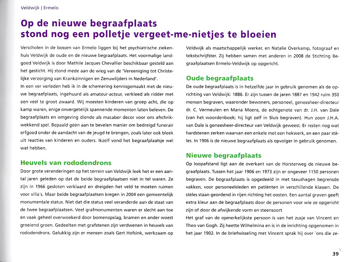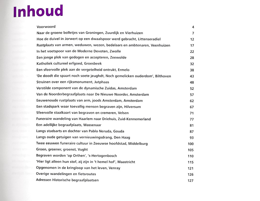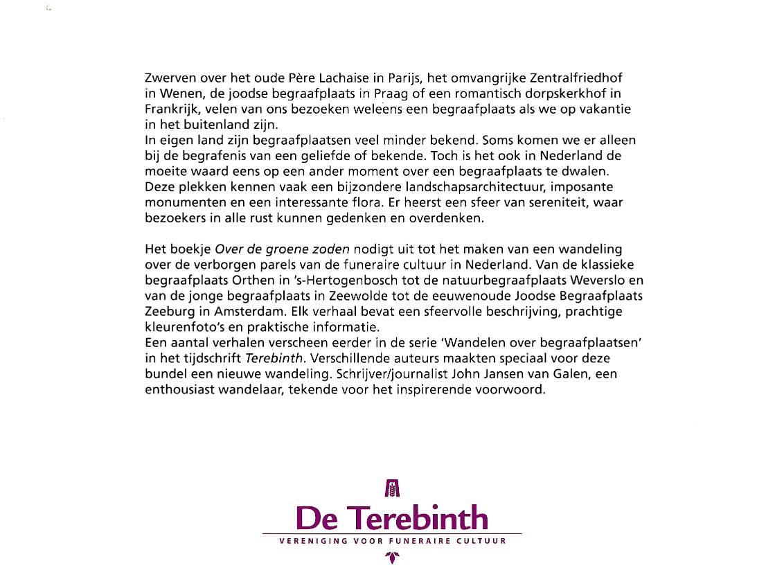 Ter gelegenheid van de Week van de Begraafplaats geeft de Vereniging De Terebinth een boekje uit met een bundeling van wandelingen over begraafplaatsen in Nederland. Een fris ogend boekje dat uitnodigt tot het maken van een wandeling over ‘de verborgen parels van de funeraire cultuur in Nederland’. Van de klassieke begraafplaats Orthen in ’s-Hertogenbosch tot de natuurbegraafplaats Weverlo en van de ‘jonge’ begraafplaats in Zeewolde tot de eeuwenoude joodse begraafplaats Zeeburg in Amsterdam. Een aantal verhalen verscheen eerder in de serie ‘Wandelen over begraafplaatsen’ in het tijdschrift Terebinth. Verschillende auteurs schreven speciaal voor deze bundel een nieuwe wandeling. John Jansen van Galen, een enthousiast wandelaar, schreef het voorwoord.