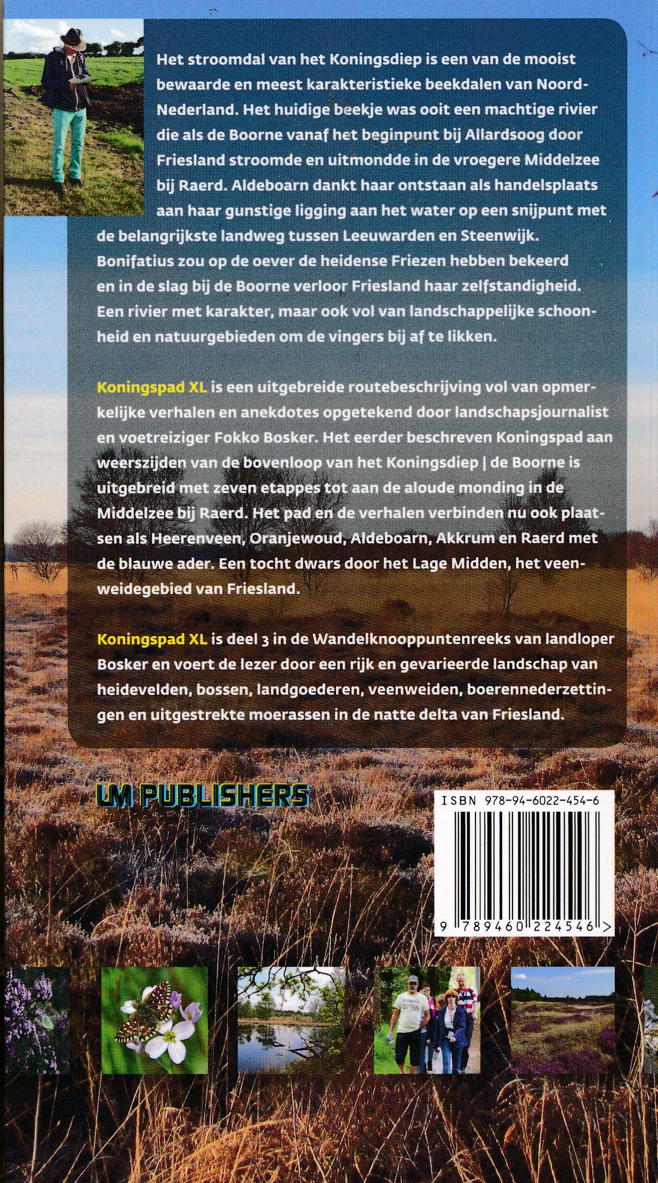 Het stroomdal van het Koningsdiep is een van de mooist bewaarde en karakteristieke beekdalen van Noord-Nederland. Het huidige beekje was ooit een machtige rivier die als Boorne vanaf het beginpunt bij Allardsoog door Friesland stroomde en uitmondde in de vroegere Middelzee bij Raerd. Aldeboarn dankt haar ontstaan als handelsplaats aan haar gunstige ligging aan het water op een snijpunt met de belangrijkste landweg tussen Leeuwarden en Steenwijk. Bonifatius zou op de oever de heidense Friezen hebben bekeerd en in de slag bij de Boorne verloor Friesland haar zelfstandigheid. Een rivier met karakter, maar ook vol van landschappelijke schoonheid en natuurgebieden om de vingers bij af te likken. Koningspad XL is een uitgebreide routebeschrijving vol van opmerkelijke verhalen en anekdotes opgetekend door landschapsjournalist en voetreiziger Fokko Bosker. Het eerder beschreven Koningspad aan weerszijden van de bovenloop van het Koningsdiep de Boorne is uitgebreid met zes etappes tot aan de aloude monding bij Raerd in de Middelzee. Het pad en de verhalen verbinden nu ook plaatsen als Heerenveen, Aldeboarn, Akkrum en Raerd met de blauwe ader. Een tocht dwars door het Lage Midden, het veenweidegebied van Friesland. Koningspad XL is deel 3 in de Wandelknooppuntenreeks van landloper Bosker en voert de lezer door een rijk en gevarieerde landschap van heidevelden, bossen, landgoederen, veenweiden, boerennederzettingen en uitgestrekte moerassen in de natte delta van Friesland.