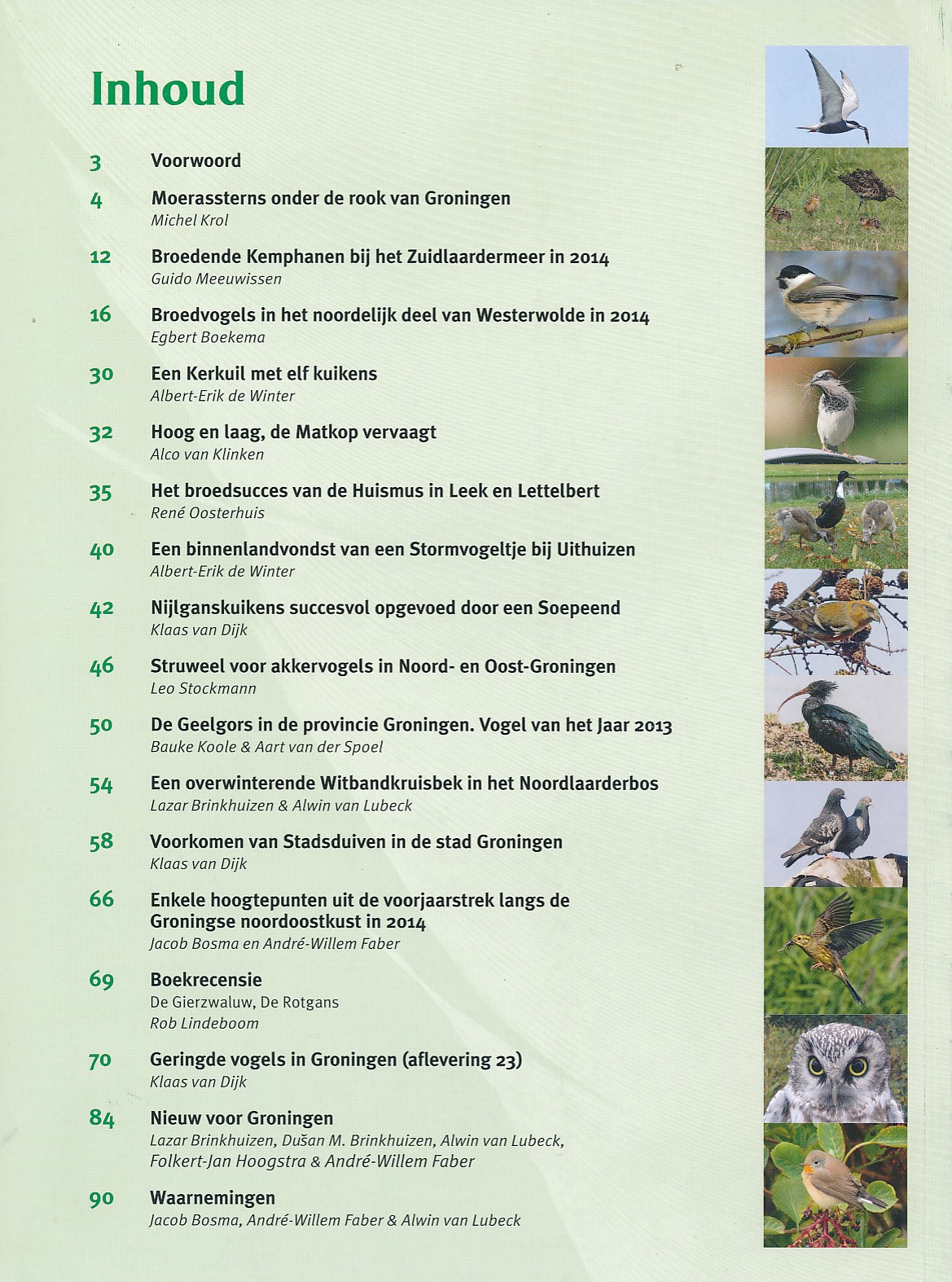 De trots van Avifauna Groningen: het prachtig vormgegeven jaarblad 2015 is verschenen. Met inhoudelijke sterke artikelen over diverse aspecten van de vogels in de provincie. Dit jaar een dikke uitgave van meer dan 100 pagina's. Voor inhoud zie de afbeelding van de achterzijde.