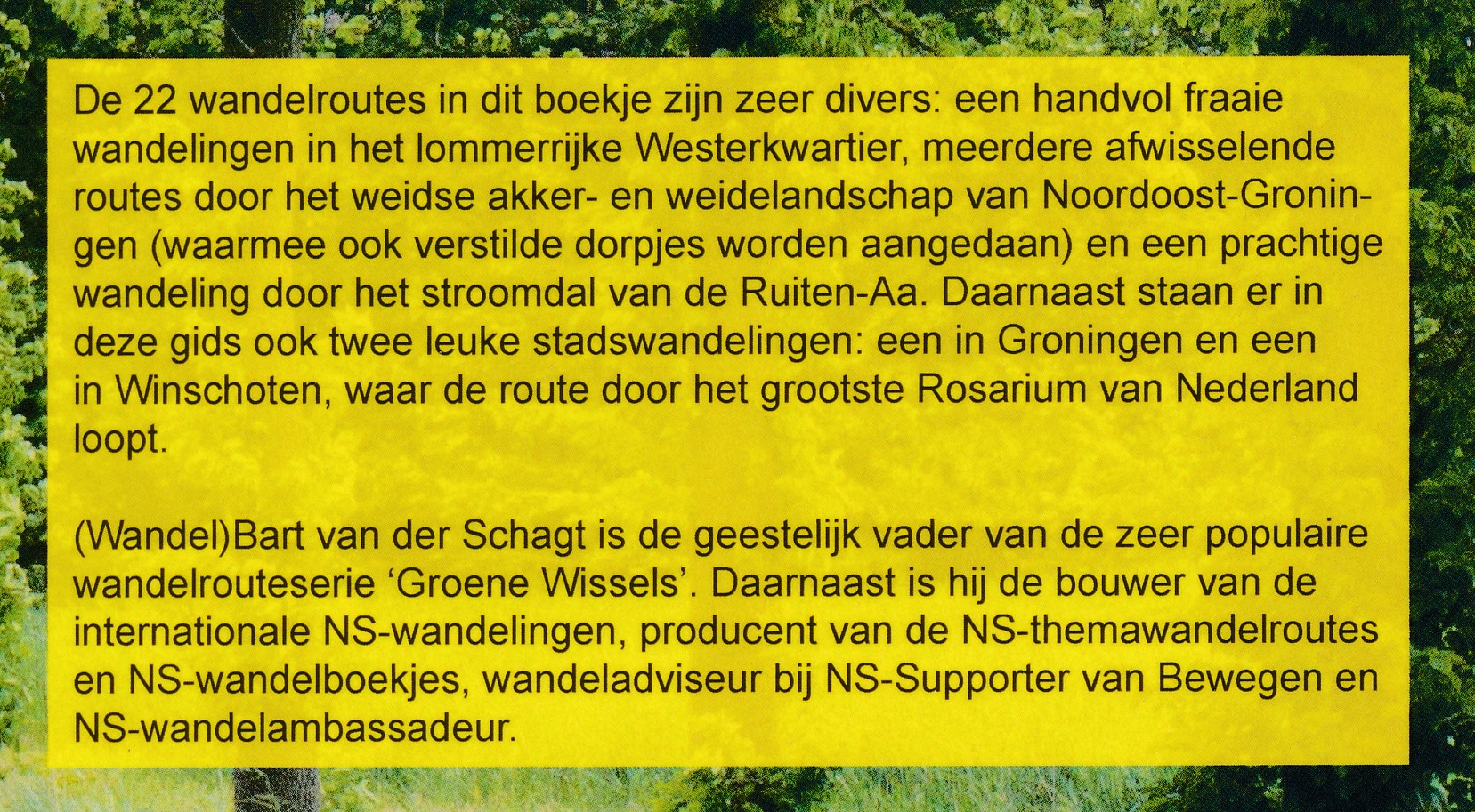 De 22 wandelroutes in dit boekje zijn zeer divers: een handvol fraaie wandelingen in het lommerrijke Westerkwartier, meerdere afwisselende routes door het weidse akker- en weidelandschap van Noordoost-Groningen (waarmee ook verstilde dorpjes worden aangedaan) en een prachtige wandeling door het stroomdal van de Ruiten-Aa. Daarnaast staan er in deze gids ook twee leuke stadswandelingen: een in Groningen en een in Winschoten, waar de route door het grootste Rosarium van Nederland loopt. (Wandel)Bart van der Schagt is de geestelijk vader van de zeer populaire wandelrouteserie ‘Groene Wissels’. Daarnaast is hij de bouwer van de internationale NS-wandelingen, producent van de NS-themawandelroutes en NS-wandelboekjes, wandeladviseur bij NS-Supporter van Bewegen en NS-wandelambassadeur.