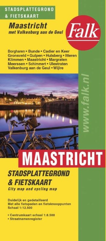 Traditionele stadsplattegrond en moderne Fietskaart in één. Met deze kaart van Maastricht en omgeving vang je twee vliegen in één klap. Alle straatnamen van de stad en de omliggende dorpen zijn terug te vinden op de kaart. Zelfs de straatnamen in het buitengebied zijn weergegeven.
