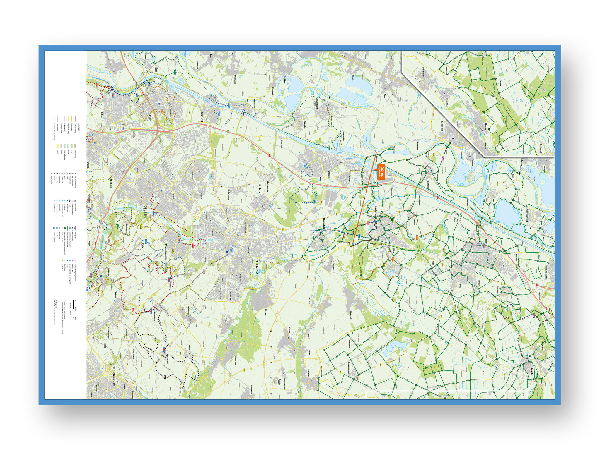 Wandelkaart 4 Grensmaasvallei heeft een schaal van 1: 25.000 en heeft een bijna topografische ondergrond. De wandelingen, die via gekleurde paaltjesroute gaat, zijn gelegen in de Gemeenten Beek, Echt-Susteren, Schinnen, Sittard-Geleen, Stein. Tevens zijn er ook wandelingen in delen van de Gemeenten Brunssum, Meerssen, Nuth en Onderbanken opgenomen. Voor de echte wandelliefhebber, een kaart die niet mag ontbreken!