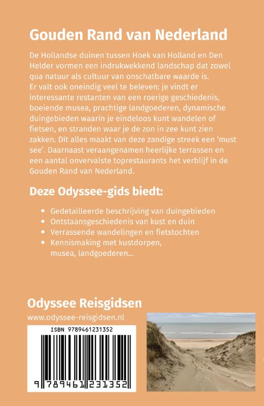 Gouden Rand van Nederland De Hollandse duinen tussen Hoek van Holland en Den Helder vormen een indrukwekkend landschap dat zowel qua natuur als cultuur van onschatbare waarde is. Er valt ook oneindig veel te beleven: je vindt er interessante restanten van een roerige geschiedenis, boeiende musea, prachtige landgoederen, dynamische duingebieden waarin je eindeloos kunt wandelen of fietsen, en stranden waar je de zon in zee kunt zien zakken. Dit alles maakt van deze zandige streek een ‘must see’. Daarnaast veraangenamen heerlijke terrassen en een aantal onvervalste toprestaurants het verblijf in de Gouden Rand van Nederland. Deze Odyssee-gids biedt: - Gedetailleerde beschrijving van duingebieden - Ontstaansgeschiedenis van kust en duin - Verrassende wandelingen en fietstochten - Kennismaking met kustdorpen, musea, landgoederen... 1