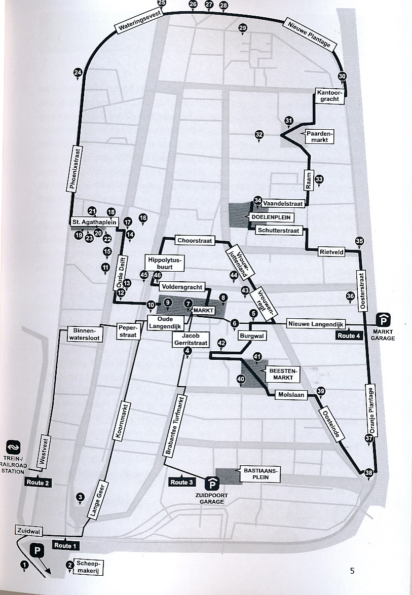 Stadsgids van Delft met een wandelroute, met vier verschillende startpunten, door het centrum.
