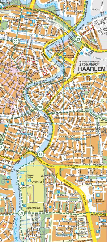 Traditionele stadsplattegrond en moderne Fietskaart in één. Met deze kaart van Haarlem en omgeving vang je twee vliegen in één klap. Alle straatnamen van de stad en de omliggende dorpen zijn terug te vinden op de kaart. Zelfs de straatnamen in het buitengebied zijn weergegeven.