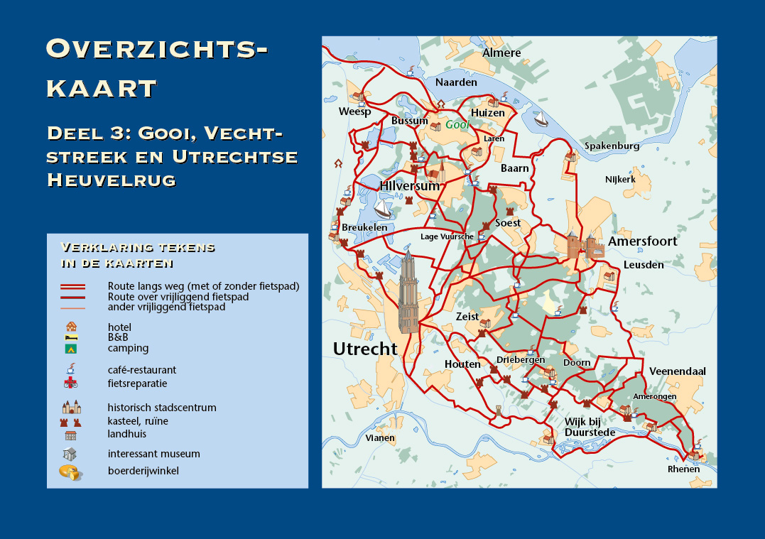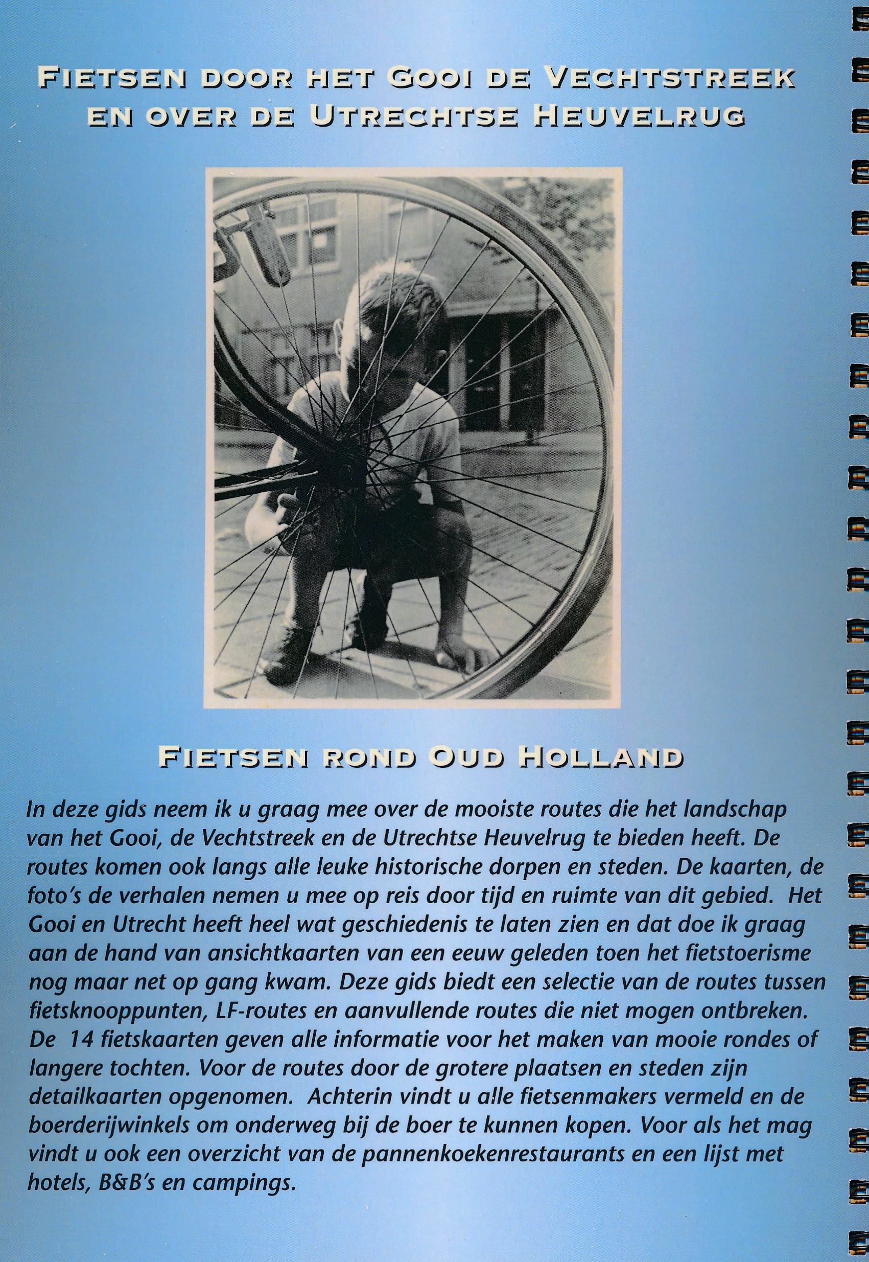 Voor ieder die wil genieten van de talloze fietspaadjes door de bos en heidegebieden van het Gooi en de Utrechtse Heuvelrug. Maar ook voor wie alle andere paadjes langs de Vecht en door de plassen van de Vechtstreek wil ontdekken tussen het Muiderslot en Utrecht. Tussen Utrecht en Rhenen vindt men de talloze kastelen in de Kromme Rijnstreek en langs de Rijn. En na Rhenen kan men door de Gelderse Vallei naar Amersfoort en langs de Eem naar Spakenburg. In deze gids niet alleen de fietsenmakers, maar ook alle overnachtingsadressen en de pannenkoekenrestaurants.