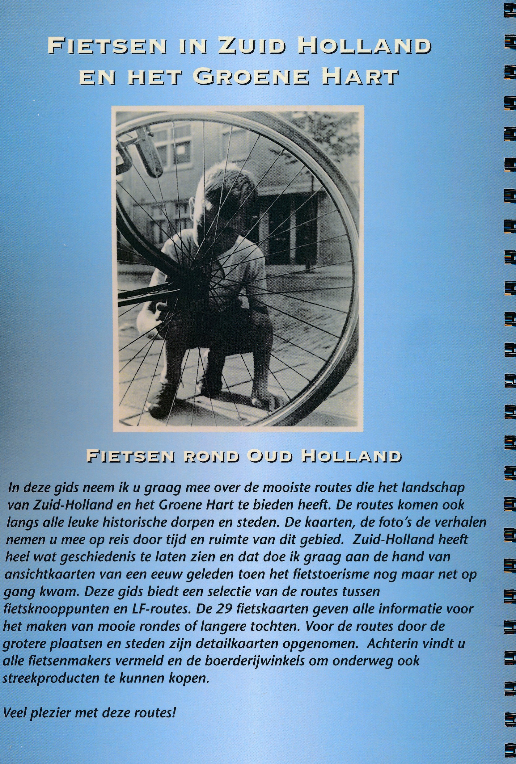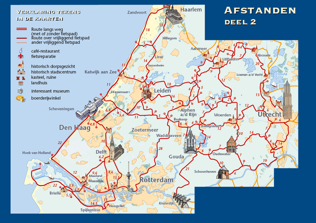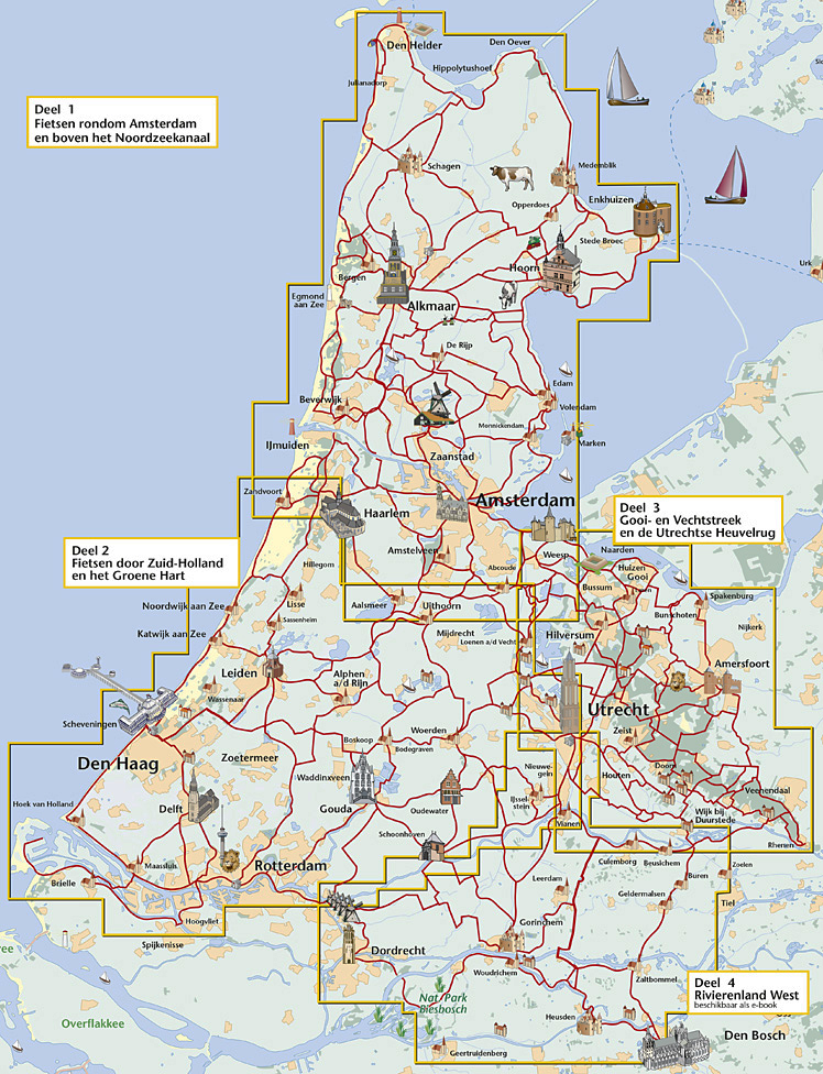 Voor ieder die vanaf de duinen tussen Zandvoort en Hoek van Holland het achterland wil verkennen met de bloeiende tulpen in de Bollenstreek, het Groene Hart met zijn talloze dijkjes, molens, plassen, waar de grond weliswaar per liter wordt verkocht maar waar de Hollanders hun bestaan op het water hebben veroverd en daar de mooiste steden en stadjes als Gouda en Oudewater hebben laten verrijzen. Hier fiets je langs stroompjes en rivieren waaraan zoals bij de Vecht de rijke buitenplaatsen ontstonden.