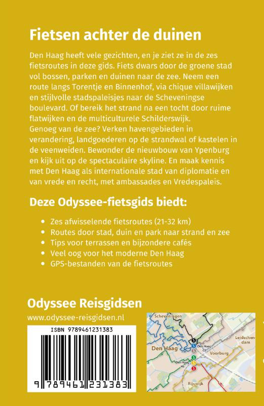 Fietsen achter de duinen Den Haag heeft vele gezichten, en je ziet ze in de zes fietsroutes in deze gids. Fiets dwars door de groene stad vol bossen, parken en duinen naar de zee. Neem een route langs Torentje en Binnenhof, via chique villawijken en stijlvolle stadspaleisjes naar de Scheveningse boulevard. Of bereik het strand na een tocht door ruime flatwijken en de multiculturele Schilderswijk. Genoeg van de zee? Verken havengebieden in verandering, landgoederen op de strandwal of kastelen in de veenweiden. Bewonder de nieuwbouw van Ypenburg en kijk uit op de spectaculaire skyline. En maak kennis met Den Haag als internationale stad van diplomatie en van vrede en recht, met ambassades en Vredespaleis.