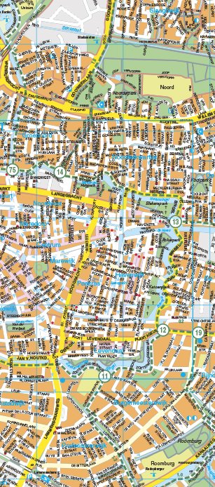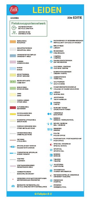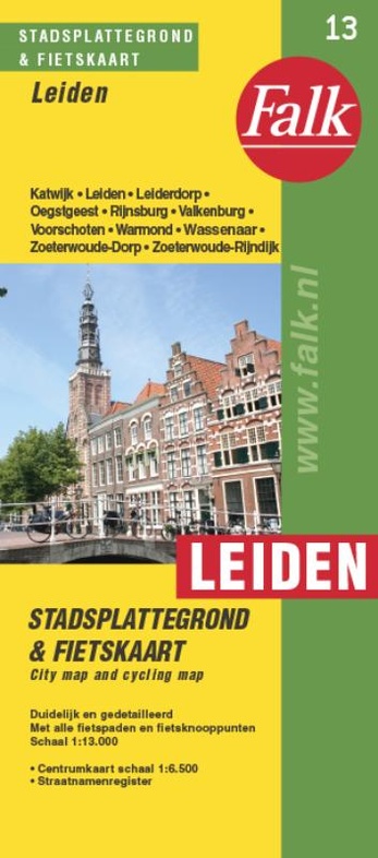 Stadsplattegrond van de Leiden van de bekende kaartenmaker Falk. Met omliggende wijken en dorpen als Leiderdorp, Oegstgeest, Voorschoten, Warmond, Zoeterwoude-Dorp & Zoeterwoude-Rijdijk. Duidelijk en gedetailleerd.