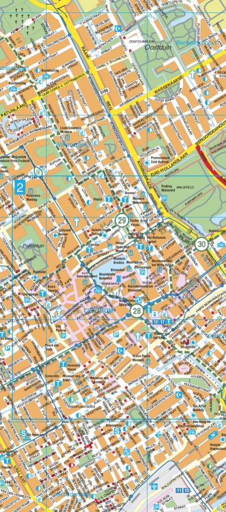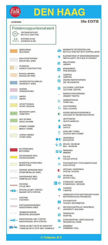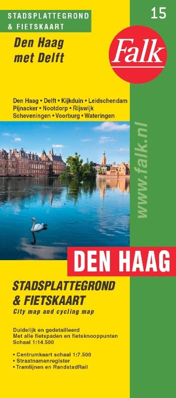 De stadsplattegrond van Den Haag is regionaal uitgebreid met Delft, Kijkduin, Leidschendam, Pijnacker, Nootdorp, Rijswijk, Scheveningen, Voorburg en Wateringen. Van al deze plaatsen is het straatnamenregister weergegeven op de achterzijde van de kaart. De extra bijgeleverde detailkaarten van het centrum van Den Haag en Delft geven je nog meer overzicht als je het stadscentrum lopend wilt bezoeken. Dankzij het fietsknooppunten netwerk dat ook op de kaart te vinden is, kun je de groene omgeving en de buurtgemeenten van Den Haag verkennen en ontdek je ook deze groene binnenstad met de fiets.