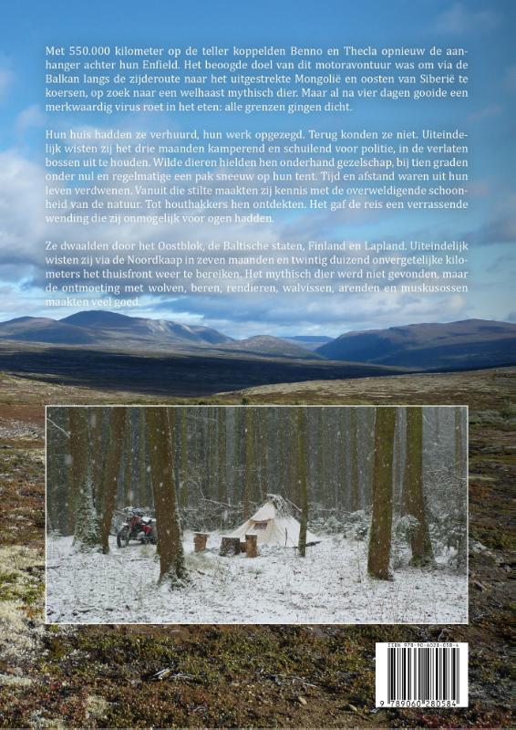 Met 550.000 kilometer op de teller koppelden Benno en Thecla opnieuw de aanhanger achter hun Enfield. Het beoogde doel van dit motoravontuur was om via de Balkan langs de zijderoute naar het uitgestrekte Mongolië en oosten van Siberië te koersen, op zoek naar een welhaast mythisch dier. Maar al na vier dagen gooide een merkwaardig virus roet in het eten: alle grenzen gingen dicht. Hun huis hadden ze verhuurd, hun werk opgezegd. Terug konden ze niet. Uiteindelijk wisten zij het drie maanden kamperend en schuilend voor politie, in de verlaten bossen uit te houden. Wilde dieren hielden hen onderhand gezelschap, bij tien graden onder nul en regelmatige een pak sneeuw op hun tent. Tijd en afstand waren uit hun leven verdwenen. Vanuit die stilte maakten zij kennis met de overweldigende schoonheid van de natuur. Tot houthakkers hen ontdekten. Het gaf de reis een verrassende wending die zij onmogelijk voor ogen hadden. Ze dwaalden door het Oostblok, de Baltische staten, Finland en Lapland. Uiteindelijk wisten zij via de Noordkaap in zeven maanden en twintig duizend onvergetelijke kilometers het thuisfront weer te bereiken. Het mythisch dier werd niet gevonden, maar de ontmoeting met wolven, beren, rendieren, walvissen, arenden en muskusossen maakten veel goed.Reviews