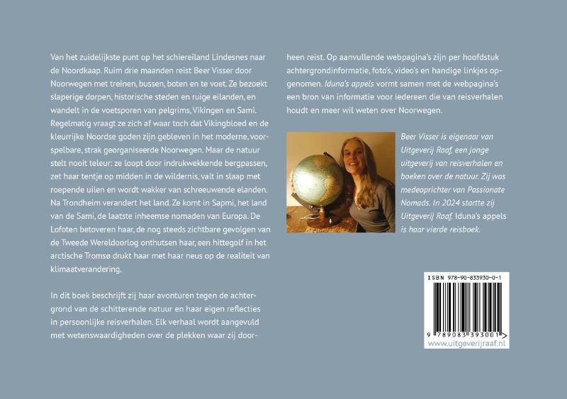 Van het zuidelijkste punt op het schiereiland Lindesnes naar de Noordkaap. Ruim drie maanden reist Beer Visser door Noorwegen met treinen, bussen, boten en te voet. Ze bezoekt slaperige dorpen, historische steden en ruige eilanden, en wandelt in de voetsporen van pelgrims, Vikingen en Sami. Regelmatig vraagt ze zich af waar toch dat Vikingbloed en de kleurrijke Noordse goden zijn gebleven in het moderne, strak georganiseerde Noorwegen. Maar de natuur stelt nooit teleur: ze loopt door indrukwekkende bergpassen, zet haar tentje op midden in de wildernis, valt in slaap met roepende uilen en wordt wakker van schreeuwende elanden. Na Trondheim verandert het land. Ze komt in Sapmi, het land van de Sami, de laatste inheemse nomaden van Europa. De Lofoten betoveren haar, de nog steeds zichtbare gevolgen van de Tweede Wereldoorlog onthutsen haar, een hittegolf in het arctische Tromsø drukt haar met haar neus op de realiteit van klimaatverandering. In dit boek beschrijft zij haar avonturen tegen de achtergrond van de schitterende natuur en haar eigen reflecties in persoonlijke reisverhalen. Elk verhaal wordt aangevuld met wetenswaardigheden over de plekken waar zij doorheen reist. Op aanvullende webpagina’s zijn per hoofdstuk achtergrondinformatie, foto’s en handige linkjes opgenomen. Iduna’s appels vormt samen met de webpagina’s een bron van informatie voor iedereen die van reisverhalen houdt en meer wil weten over Noorwegen.
