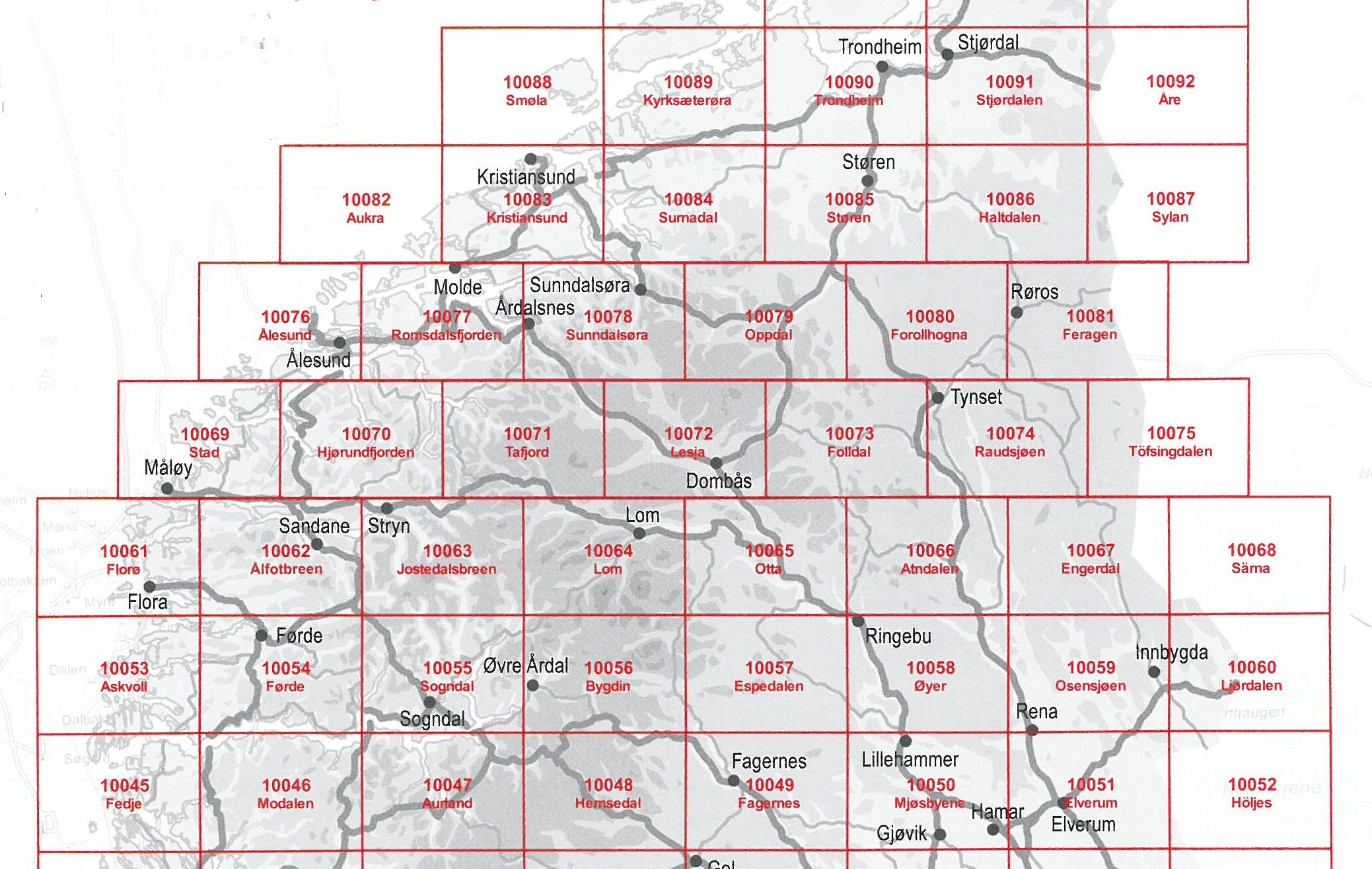 Overzicht topografische kaarten Noorwegen Midden 1:50.000 Norge Serien
