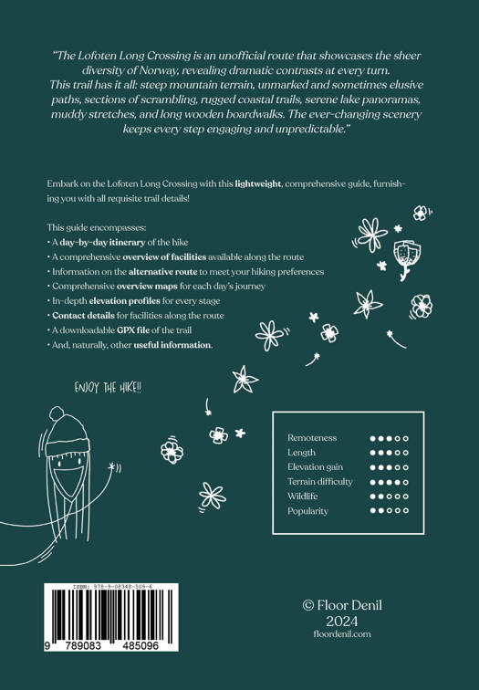 “The Lofoten Long Crossing is an unofficial route that showcases the sheer diversity of Norway, revealing dramatic contrasts at every turn.This trail has it all: steep mountain terrain, unmarked and sometimes elusive paths, sections of scrambling, rugged coastal trails, serene lake panoramas, muddy stretches, and long wooden boardwalks. The ever-changing scenery keeps every step engaging and unpredictable.”Embark on the Lofoten Long Crossing with this lightweight, comprehensive guide, furnishing you with all requisite trail details!This guide encompasses:• A day-by-day itinerary of the hike• A comprehensive overview of facilities available along the route• Information on the alternative route to meet your hiking preferences• Comprehensive overview maps for each day’s journey• In-depth elevation profiles for every stage• Contact details for facilities along the route• A downloadable GPX file of the trail• And, naturally, other useful information.