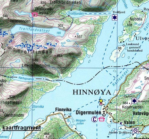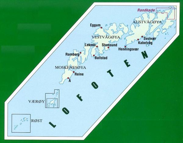 Gedetailleerde topografische wandelkaart van de Lofoten. De wandel- en fietsroutes zijn op de kaart ingetekend. Verder zijn er wintersportroutes vermeld. Campings, hutten, jeugdherbergen, hoogtelijnen zijn aanwezig op de kaart. Vaeroy 1:50.000