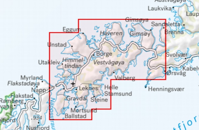 Plaatsen op deze kaart: Gimsoya, Brenna, Haveren, Valberg, Borge, Vestvagoya, Eggum, Unstad, Utakleiv, Himmeltindan, Leknes, Helle Stamsund, Steine, Gravdal, Mortsund, Ballstad, Napp