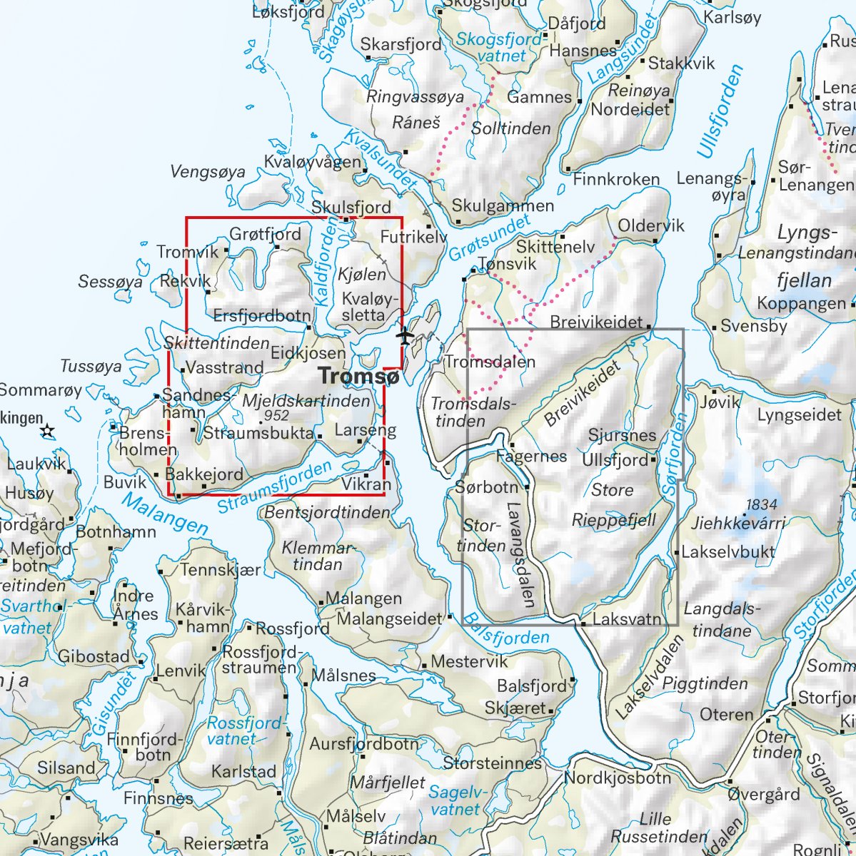 Uitgever: Dit is een van de twee unieke kaarten met een schat aan details die nog nooit eerder zijn gezien van het gebied rond Tromsø. De terreininformatie op de kaart is gebaseerd op laserscanning vanuit de lucht. Berghellingen, beken, gletsjers en andere natuurlijke elementen worden met deze technologie veel gedetailleerder weergegeven.
