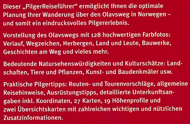 Mit diesem Führer, in den die Erfahrungen aus allen Pilgerreisen der Autoren eingeflossen sind, liegt die erste umfassende Wegbeschreibung mit Karten und Höhenprofilen sowie Informationen zu allen Wegabschnitten vor. So erfährt der Leser und Nutzer wichtige Details zu jeder Meile Weg, bekommt viele Hintergrundinformationen zu Kulturbauwerken und Plätzen und sieht in großartigen Bildern, was ihn auf dem Olavsweg erwartet. Außerdem findet der Leser Übernachtungsadressen für jede Pilgeretappe. Vor manchen Etappen und Passagen warnen die Autoren, von anderen berichten sie überzeugt und begeistert, so dass man gleich aufbrechen möchte.