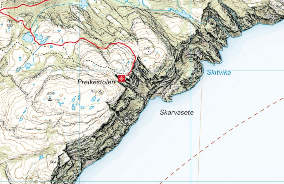 Dit is een unieke kaart met een detailniveau dat nooit eerder is vertoond voor het gebied rond Preikestolen. De terreininformatie op de kaart is gebaseerd op laserscanning vanuit de lucht. Voor het eerst worden bergkliffen, grote stenen, waterwegen en gletsjers met een nauwkeurigheid weergegeven die overeenkomt met de werkelijkheid. Een kaart op schaal 1:20.000 biedt solide informatie en is een grote hulp voor iedereen die gaat bergbeklimmen, klimmen, skiën of graag de gemarkeerde paden in de vallei verlaat en eigen routes vindt in de hoge bergen.