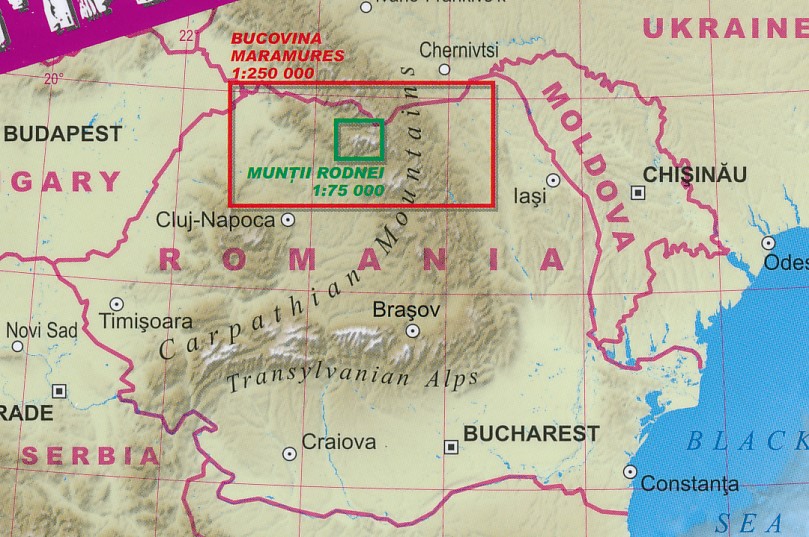 Van het gebeid Munti Rodnei is een detailkaart 1:75.000 ingevoegd.