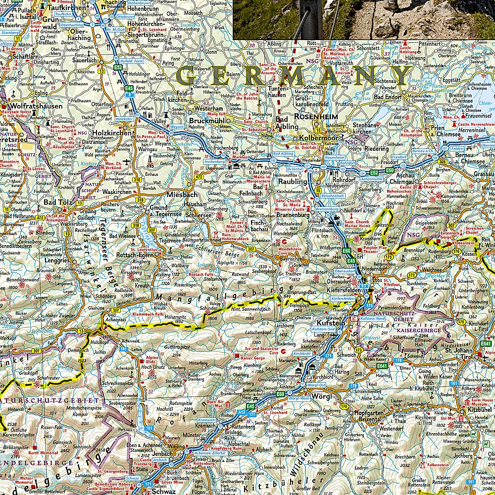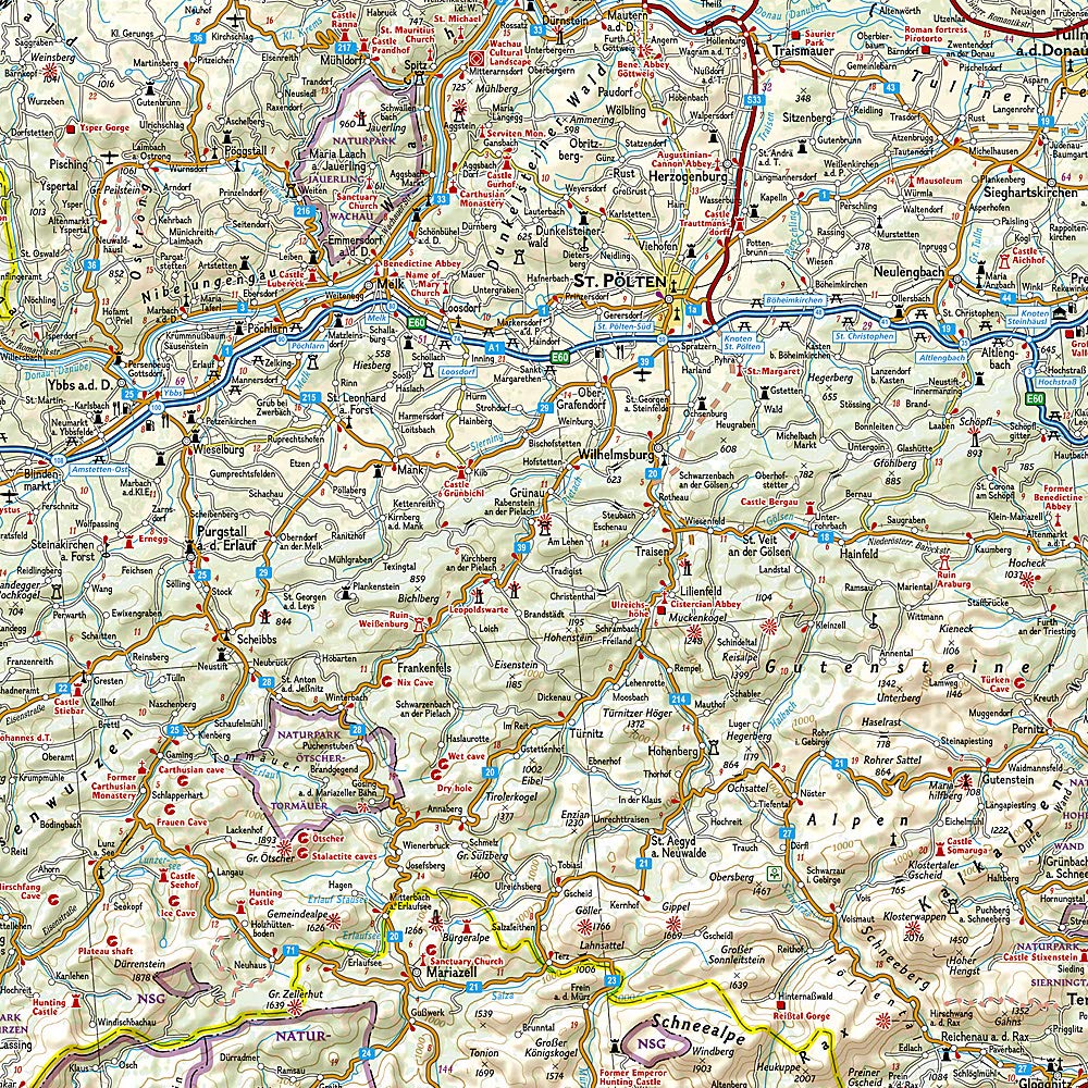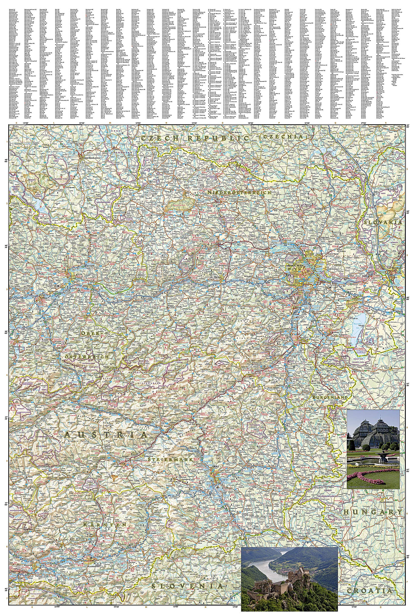 Wegenkaart van Oostenrijk met vermelding van veel bezienswaardigheden, nationale parken en attrakties. Watervast en scheurvast. Juist door deze vermeldingen onderscheidt de kaart zich van andere wegenkaarten.
