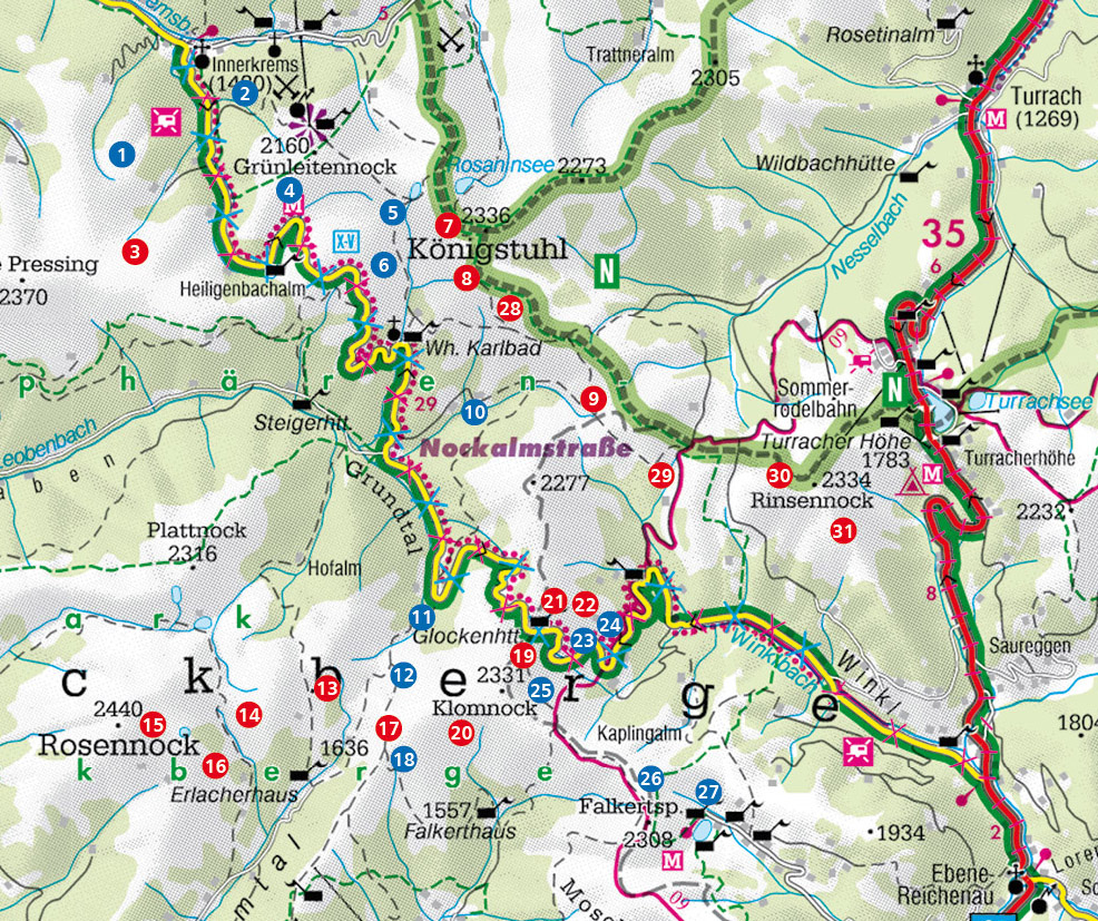 In ihrem Herzen durch den UNESCO-Biosphärenpark geschützt, liegen die Nockberge überwiegend einsam abseits des großen Touristenrummels. Diese Landschaft erschließt eine herrliche Aussichtsstraße: die 34 Kilometer lange Nockalmstraße. Sie verläuft quer durch die runden, sanften Gipfel der Gebirgsgruppe. Die Autotouristen verlieren sich rasch, wenn sich Wanderer etwas vom Band der 34 Kilometer langen Asphaltstrecke entfernen.