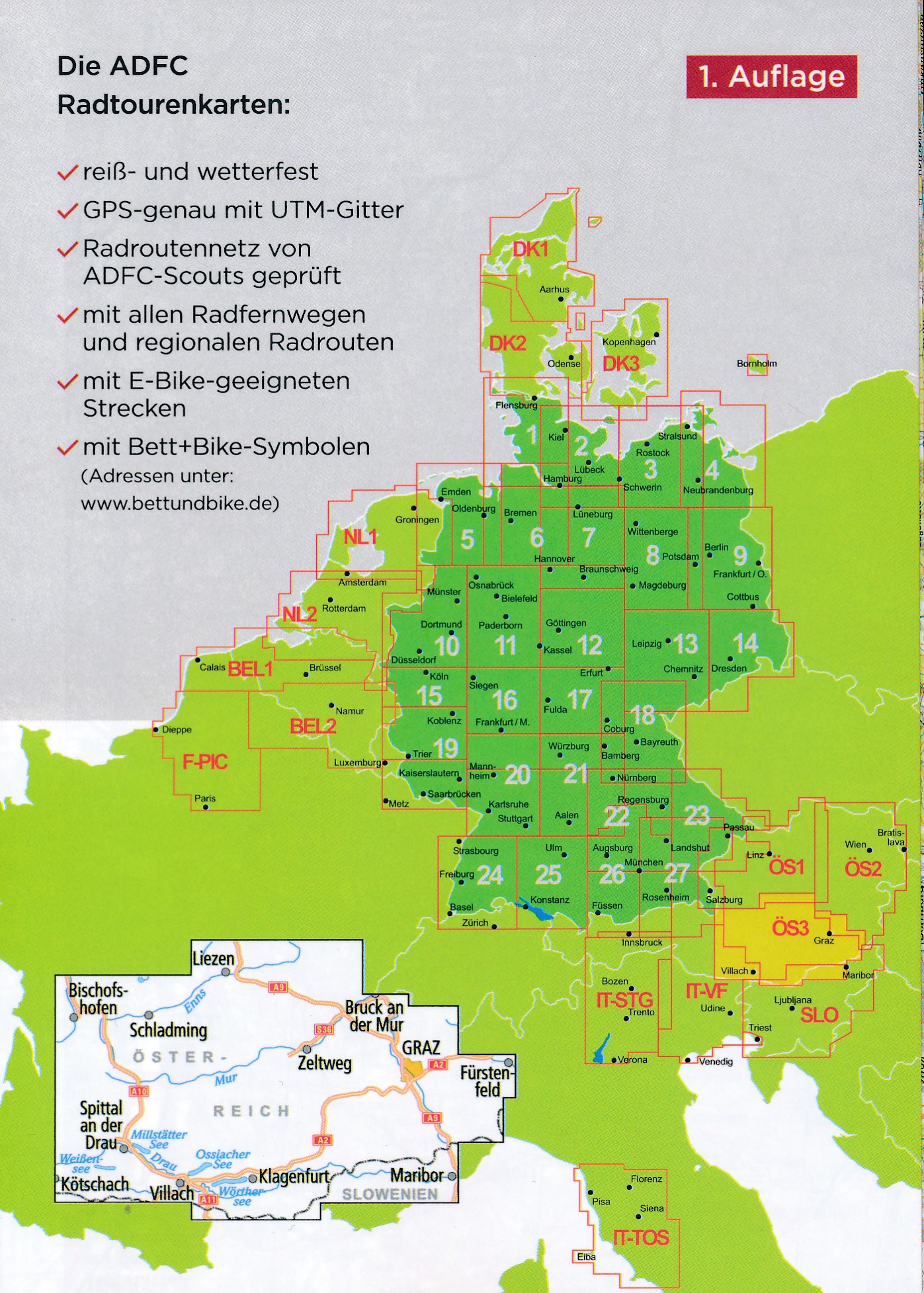 Speciaal voor fietsers gemaakte kaart, waarbij juist de autowegen minder duidelijk te lezen zijn, maar waar de fietspaden gekleurd staan weergegeven. De kleur varieert naarmate de weg beter als fietsroute geschikt is. Lange afstands fietsroutes staan ingetekend, alsmede fietsenmakers, campings en interessante toeristische bezienswaardigheden. Groot voordeel van deze kaartenserie is bovendien dat het een heel groot gebied per kaart bestrijkt: ca. 130 x 160 km.!
