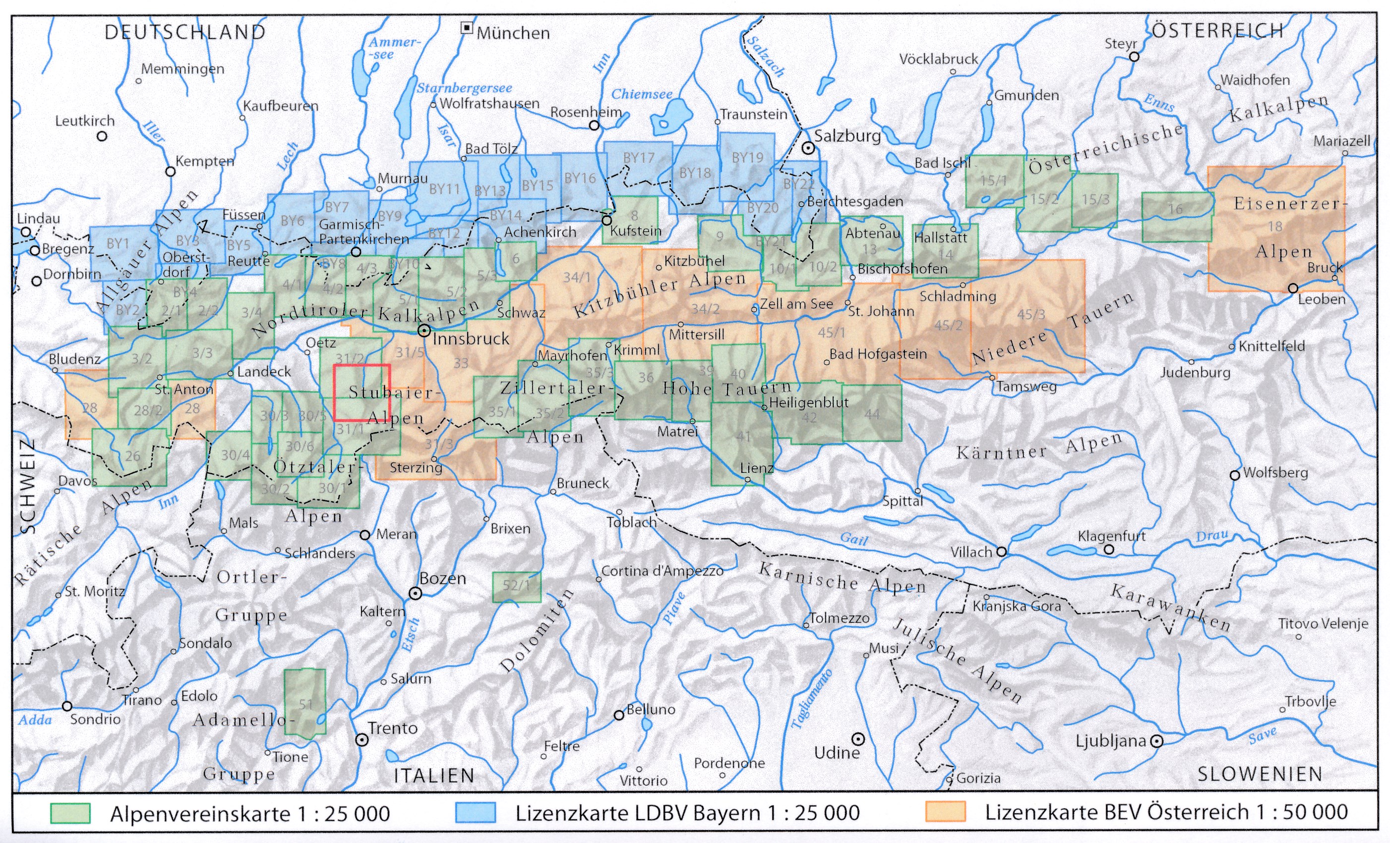 De beste en meest gedetailleerde kaarten van met name de Duitse en Oostenrijkse alpen: wandelroutes zijn naar zwaarte onderscheidend gemarkeerd, gletsjeroverschrijdingen staan aangegeven en de verschillende soorten hutten zijn ingetekend. Met als ondergrond de topografische kaarten bieden ze een schat aan informatie voor elke beginnende en gevorderde wandelaar of klimmer.