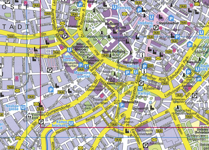 The Hallwag city map of Vienna shows the surrounds and suburbs of the city with a clear and easy to read road network at 1:15 000. The map also includes a more detailed enlargement plan of the city centre, a diagram of the metro and suburban rail system and another inset showing Athens and its environs (including Schwechat airport) highlighting the motorway exits.