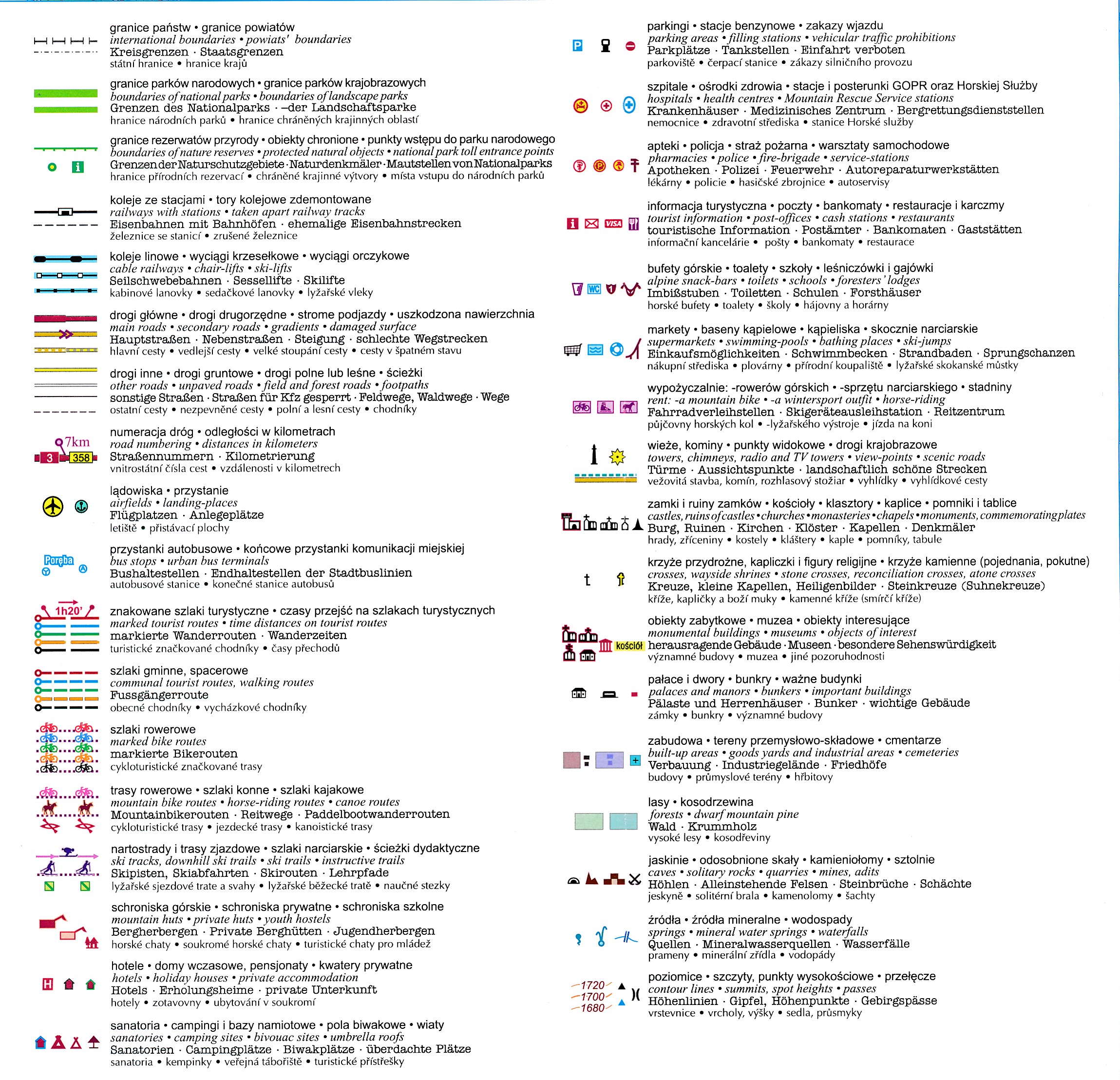 De legende bevat ongeveer 90 karakters, beschreven in 5 talen (PL, GB, D, SK, F). Zeer levendige, kleurrijke schaduwen en contourlijnen om de 20 m geven het terrein duidelijk weer. De karakteristieke kenmerken van de kaart zijn: een dicht netwerk van paden en wegen, een overzichtelijke accommodatiebasis en wandelpaden, ski- en fietspaden en -routes, overzichtelijke skiliften en kabelbanen, zorgvuldig berekende passeertijden, GPS-raster, gedetailleerde gebouwen overzichtelijk zichtbaar, zelfs in bossen.