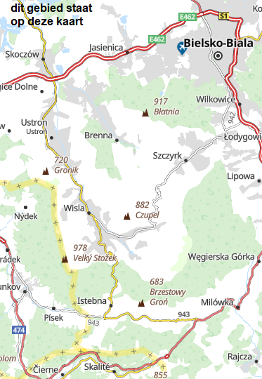 De kaart beslaat de hele Silezische Beskiden, van Bielsko-Biała tot Zwardoń en van de Shelter bij Tułem tot Kotlina Żywiecka.