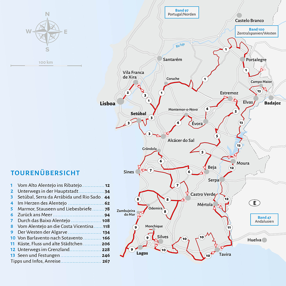 Tourenkarten Fast 3000 Kilometer kreuz und quer durch Portugals Süden, zu den bekanntesten Sehenswürdigkeiten, festgehalten in 13 ausführlich beschriebenen und sorgsam recherchierten Touren. Natur erleben, wandern Surfer finden an der Westküste Portugals allerbeste Bedingungen vor. Auch Wanderer kommen auf schmalen Pfaden entlang der Steilküste oder im Binnenland voll auf Ihre Kosten. Der Süden Portugals ist ganzjährig für fast alle Freizeitaktivitäten geeignet. Kulturschätze, Städte Beeindruckende Megalithanlagen aus der Steinzeit, Städte mit römischer oder maurischer Vergangenheit, zinnengekrönte Burgen, malerische mittelalterliche Dörfer mit weißgekalkten Häuschen und die Metropole Lissabon. Wasser erleben, baden 380 Kilometer Küste können Sie im Süden Portugals entdecken, darunter kilometerlange, einsame Strände und versteckte kleine Buchten. Außerdem zahlreiche, traumhaft schön gelegene Stauseen, romantische Wasserfälle und Flussbadestellen. WOMO-Service Genau beschriebene Anreiserouten, 223 Möglichkeiten zum Übernachten, Campen, Baden oder Picknicken, alle mit genauer Beschreibung und GPS-Koordinaten. Über 320 Farbfotos, 18 Karten und viele Tipps zu Sehenswürdigkeiten, Öffnungszeiten, usw.