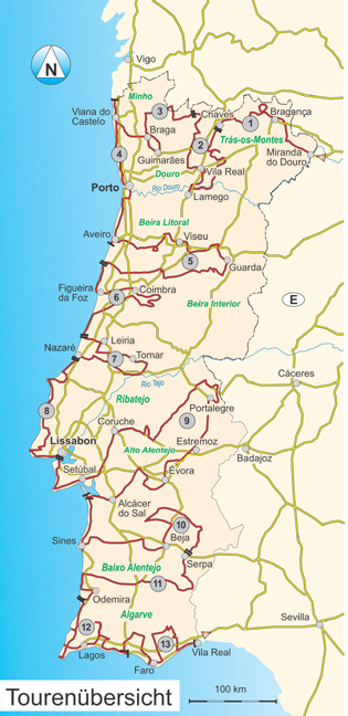 TourenkartenÜber 5000 km kreuz und quer durch Portugal, zu den bekanntesten und vielen unbekannten Sehenswürdigkeiten, beschrieben in 13 ausführlichen und sorgsam recherchierten Touren.Natur erleben, wandernSchmale Pfade entlang der Steilküste mit Ausblicke auf den Atlantik, lange Holzstege über Dünen und Wanderwege in spektakulären Gebirgslandschaften hin zu Badestellen an Flüssen oder Wasserfällen.Kulturschätze, StädteMalerische, mittelalterliche Städte, beeindruckende Burgen, Bilderbuchschlösser, gotische und manuelinische Kathedralen und Klöster, römische Ausgrabungen und die beiden unvergesslichen Metropolen Porto und Lissabon.Wasser erleben, badenIn den Wellen des wilden Atlantik toben oder lieber in einer ruhigen Lagune planschen? Im sauberen Fluss schwimmen oder einen Stausee durchkraulen? Im Thermalwasser entspannen oder unter dem Wasserfall duschen?WOMO-ServiceGenau beschriebene An-und Rückreiserouten, 345 Möglichkeiten zum Übernachten, Campen, Baden oder Rasten, alle mit GPS-Koordinaten. Über 340 Farbfotos, 16 Karten und viele, viele Tipps.