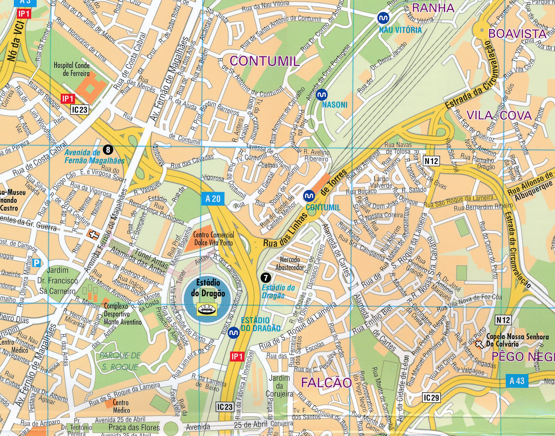 Goede geplastificeerde stadsplattegrond van Porto op schaal 1:15.000. Met extra inzetten van de meest interessante delen van de stad en aan de zijkant een korte beschrijving van de bezienswaardigheden. Met register.
