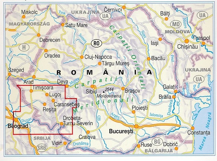 Detailkaart van het zuidwesten van Roemenië en een deel van Servië. Redelijk gedetaileerd met veel nuttige informatie.