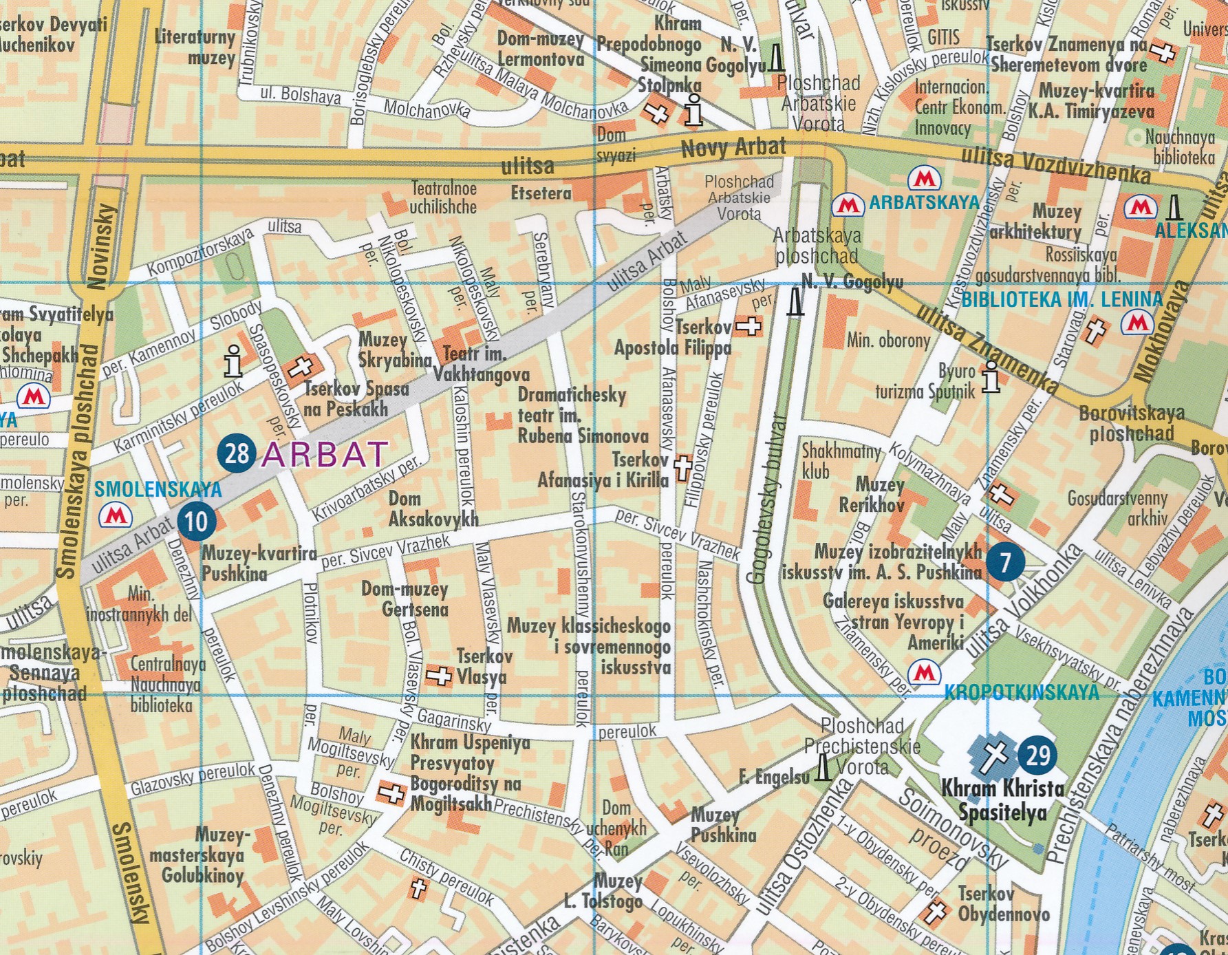 Goede geplastificeerde stadsplattegrond van Moskou op schaal 1:12.500. Met aan de zijkant een korte beschrijving van de bezienswaardigheden. Op de achterzijde een overzichtskaart van de omgeving. Met register.