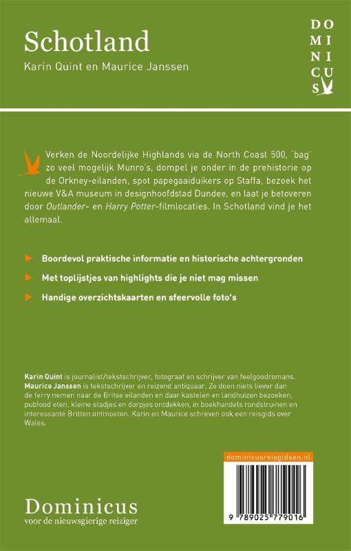 Ontdek Schotland op vakantie met deze Dominicus-reisgids en trek de woeste en ongerepte Schotse hooglanden in, verken de prachtige natuur van de eilanden aan de noord- en westkust of ga op stedentrip naar Glasgow, de grootste stad van Schotland, of bezoek Edinburgh - een sprookjesachtig oord met internationale allure. In deze reisgids vind je de mooiste wandeltochten om de natuurgebieden te ontdekken waarom Schotland bekendstaat. Ontdek de mooiste kastelen en historische plaatsjes, bezoek prachtige kathedralen en kerken en maak kennis met de hartelijke bevolking. Beleef de ultieme vakantie in Schotland, een land dat zowel per auto als vliegtuig bereikbaar is vanuit Nederland of België. Deze reisgids staat boordevol praktische informatie, historische achtergronden, handige overzichtskaarten, sfeervolle foto's en uitgebreide culturele achtergrondinformatie, is altijd up-to-date en geschreven door Nederlandstalige experts.