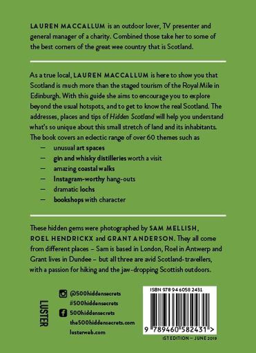 This new addition to Luster's successful, practical and attractive Hidden series, covering countries and regions, is the perfect book for those who wish to discover the most beautiful sides of Scotland. From jawdropping landscapes to interesting cities, Hidden Scotland will turn your trip into a memorable and unique experience. Experience the real beauty of Scotland through interesting lists such as the best places for streetfood in Edinburgh, the most beautiful hikes, the most surprising places to spend the night in the Highlands, the best mountain bike tracks in the South, must-visit distilleries for gin and whiskey lovers and much more. With this guide your trip to Scotland will surely become a memorable and unique experience. Author Lauren MacCallum wants the readers of her guide to have an authentic Scottish experience, because there is so much more to Scotland than the main attractions and staged tourism you see on the Royal Mile in Edinburgh. Her book is a genuine ode to the real beauty of Scotland. AUTHOR: Lauren MacCallum is a true local who works in tourism and is passionate about, among other things, outdoor sports, (music) festivals, craft beer and cosy coffee places. 90 colour images